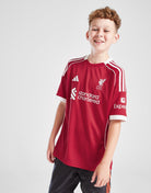 From the pitch to the stands. Show your Reds pride every time. adidas is bringing back '00s design in this juniors' Liverpool FC 2025/26 Home Shirt. In Strawberry Red with White piping detail, this streamlined shirt's cut from light, airy fabric. AEROREADY tech wicks away sweat to keep you cool. A crew neckline and short sleeves feels easy and classic. Finished with signature adidas branding and the legendary Liverpool FC club crest. Machine washable.