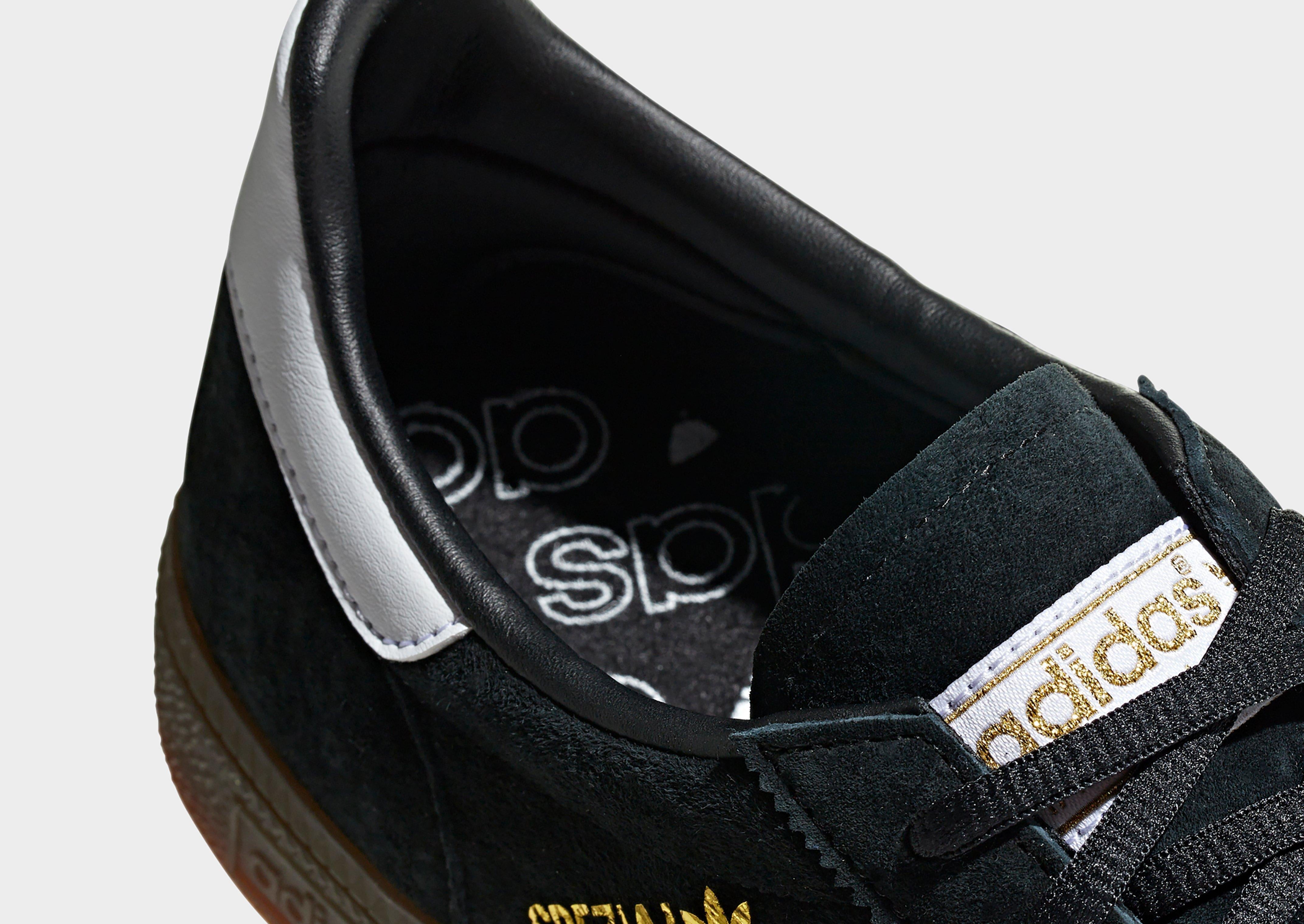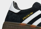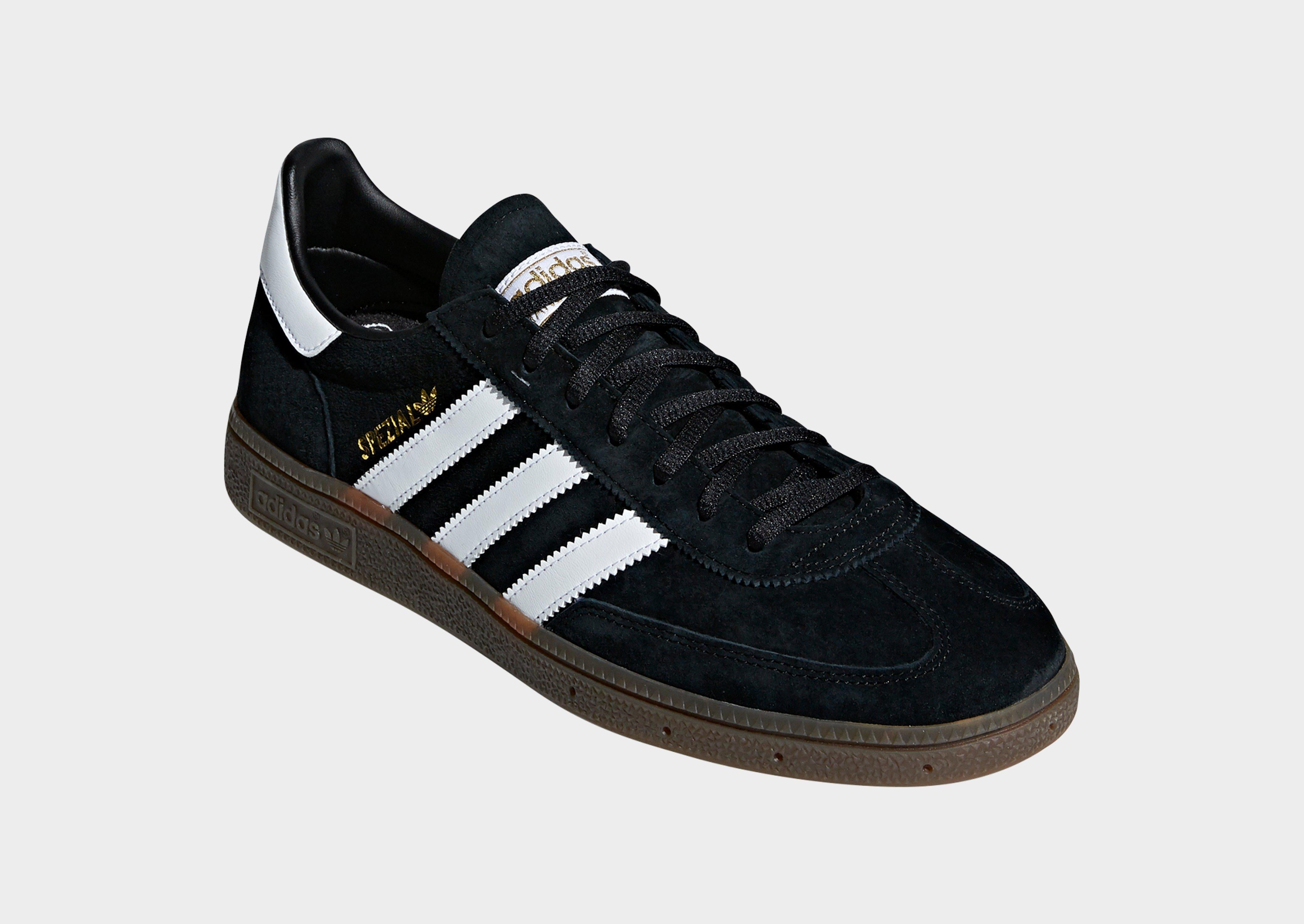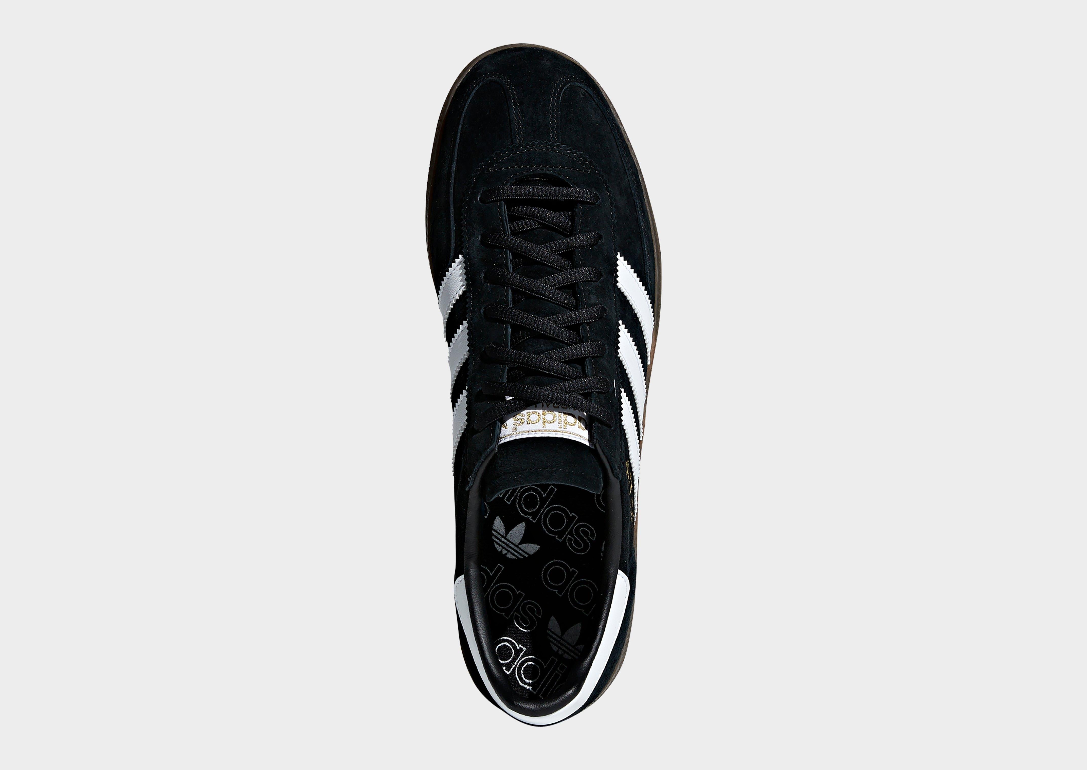 Bringin' court style to the streets, these men's Handball Spezial trainers from adidas Originals add a retro look to your off-duty 'fits. In a black colourway with white detailing to the heel, these creps are made with a suede upper for a supportive wear and a premium edge. With a padded ankle collar and tonal lacing for a locked-in fit, these trainers are sat on a low-riding gum midsole that keeps your feet cushioned and comfy. With a grippy outsole for traction on the streets, these sneakers are finished with serrated white 3-Stripes and golden Spezial branding to the sidewalls.