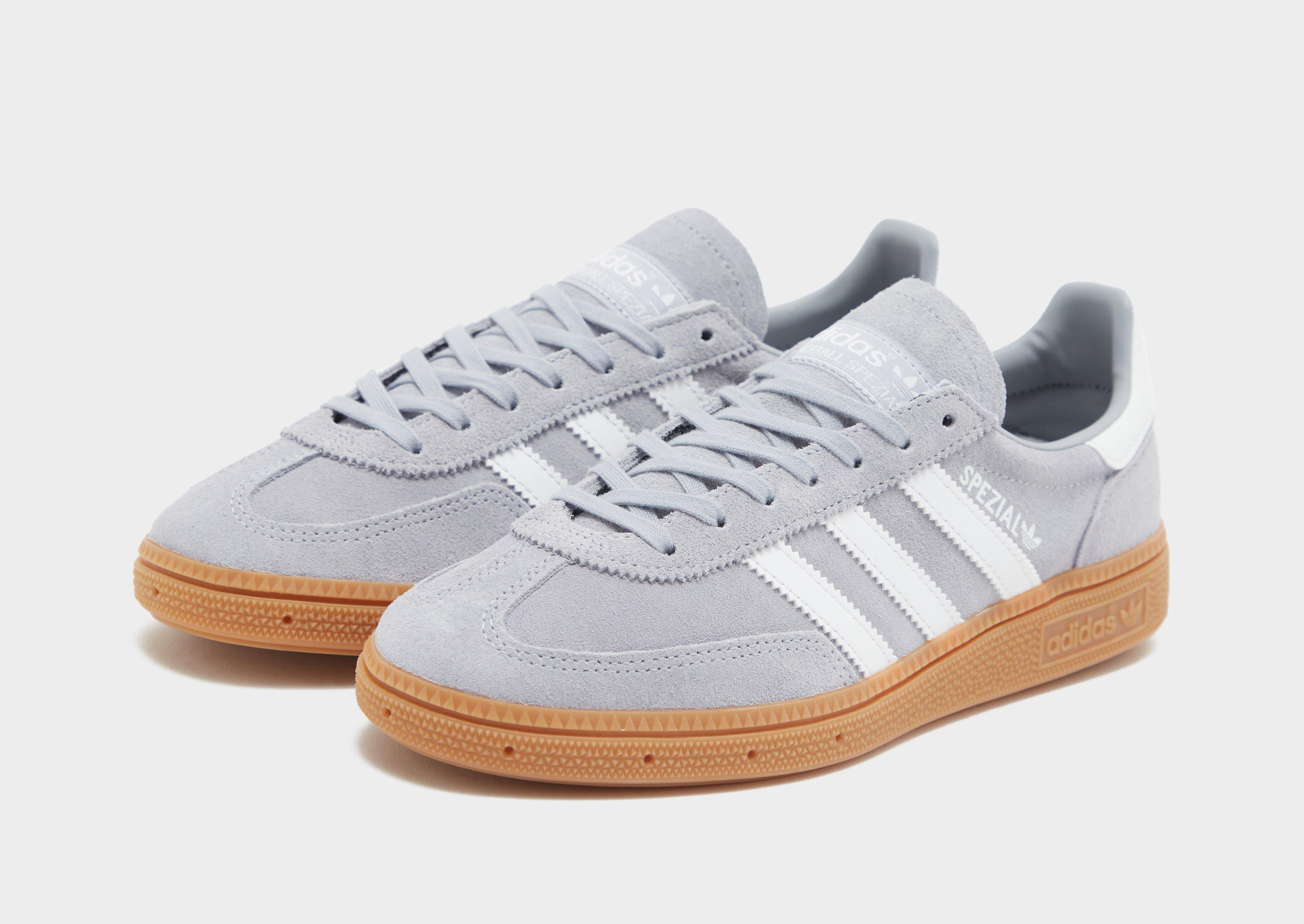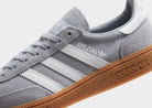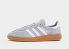 Top up your terrace rotation with these juniors' Handball Spezial trainers from adidas Originals. In a Halo Silver colourway, these JD-exclusive have a soft suede upper and OG design lines, including the classic T-toe. They feature a simple lace fastening and a synthetic lining, while the cushioned insole sits above a retro-inspired Gum 3 rubber outsole for street-ready grip. Finished off with synthetic leather 3-Stripes to the sidewalls and the Trefoil to the tongue and heel. | JH8665