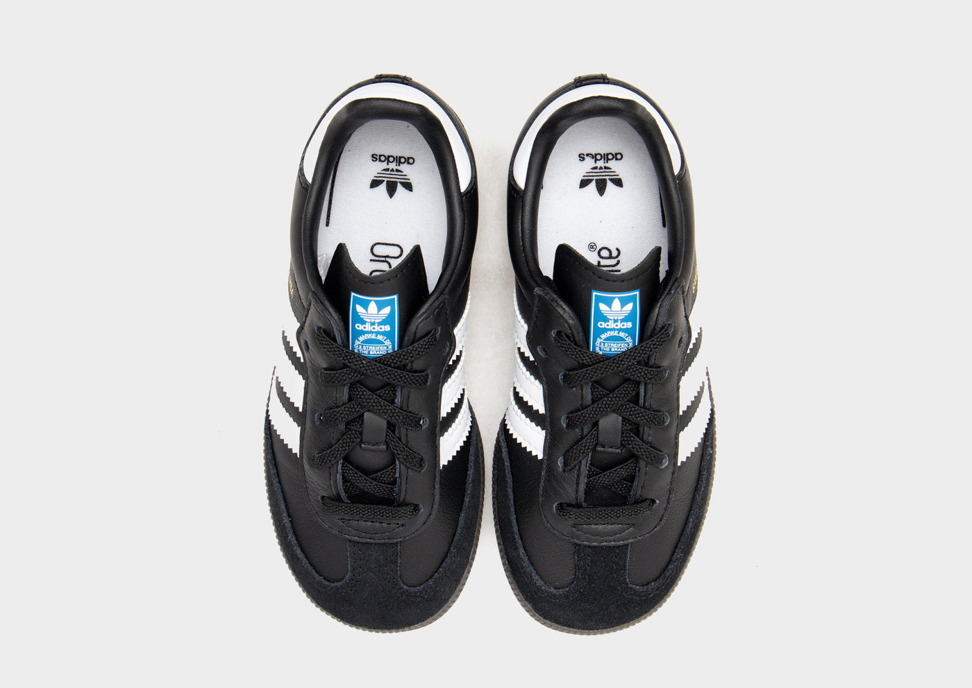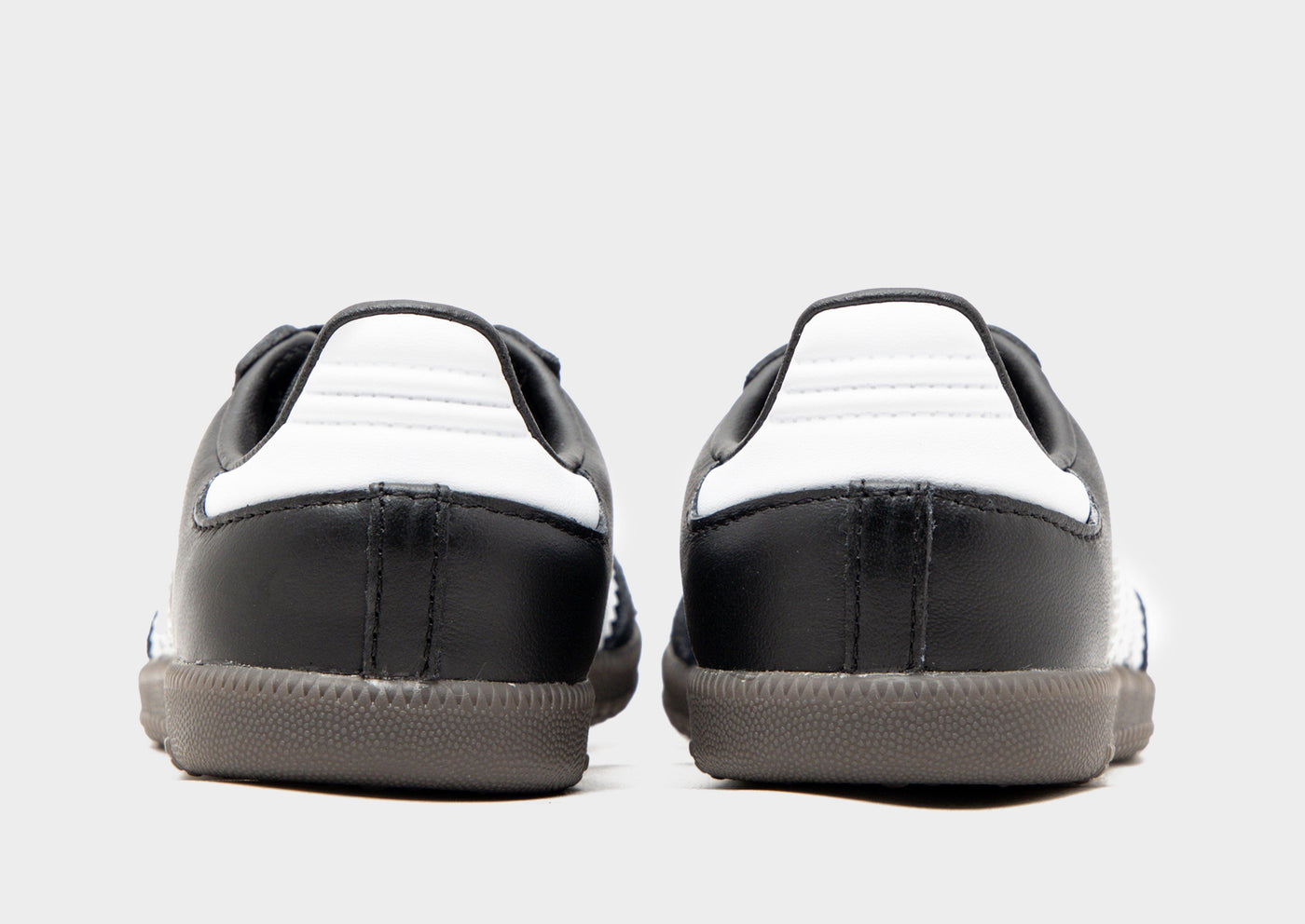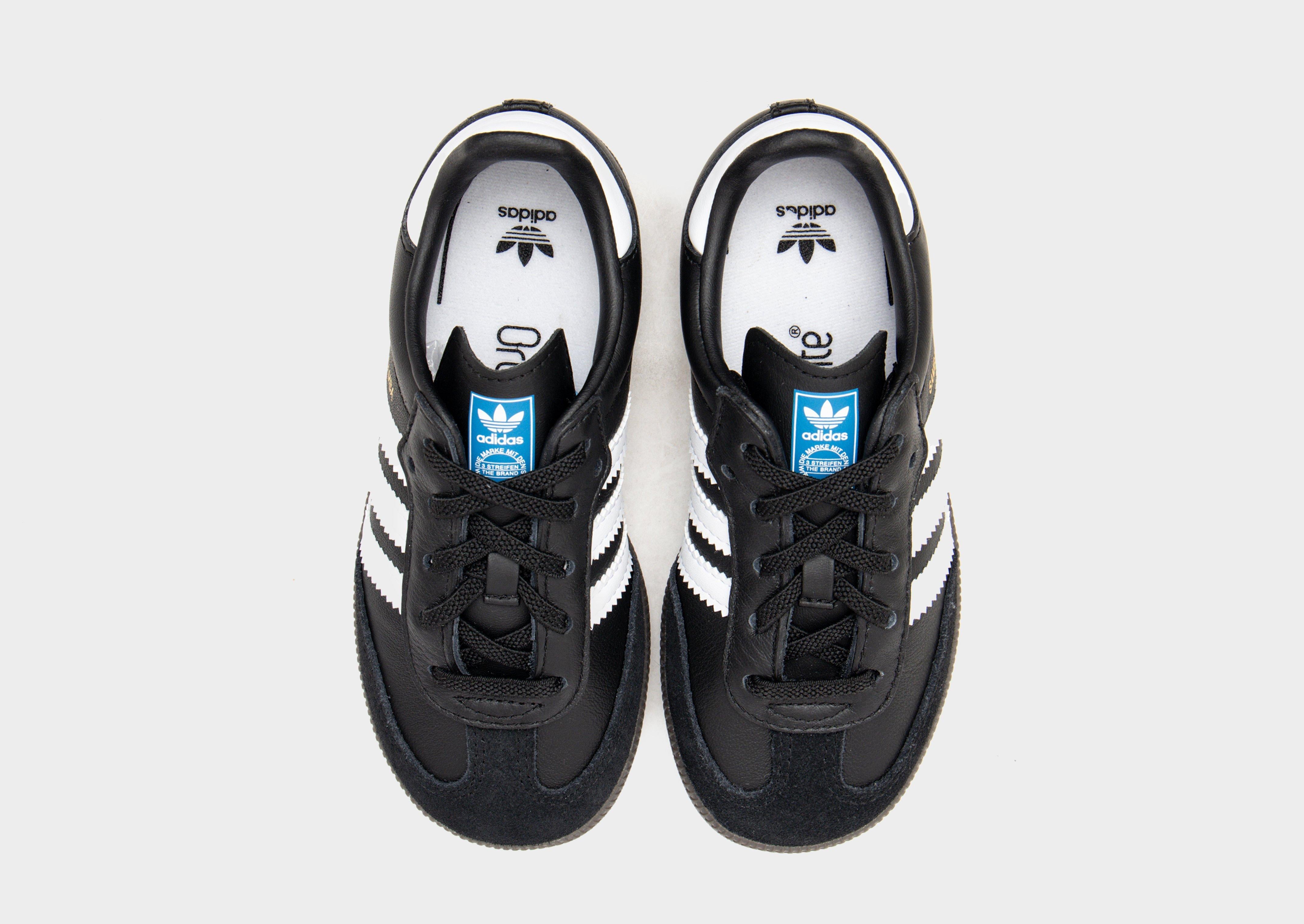 Treat 'em to a downsized terrace classic from adidas Originals in these infants' Samba OG trainers. Coming in a Core Black colourway, these low-profile kicks have a leather upper for durable wear and a premium vibe. They feature an elastic lace closure with a padded ankle collar for a snug, secure fit and a OrthoLite sockliner for cushioned comfort. Underfoot is a lightweight midsole for all-day wear and a gum rubber outsole to keep them gripped to the surface. With the famous 3-Stripes to the sidewalls, they're signed off with the Trefoil to the tongue.