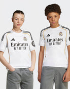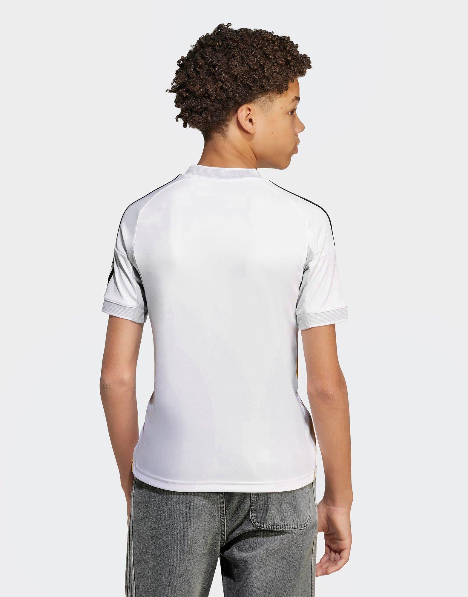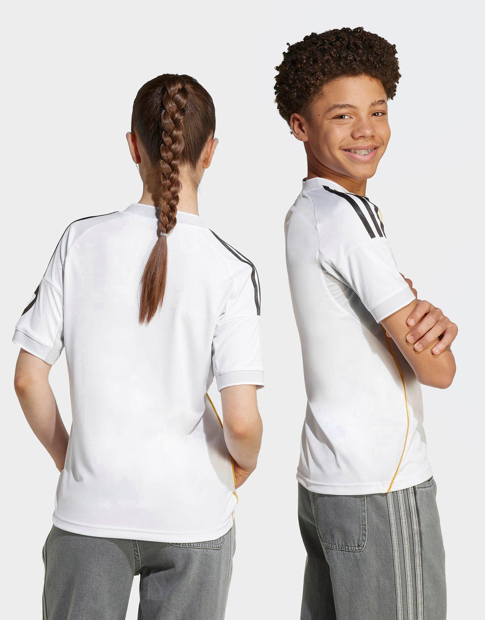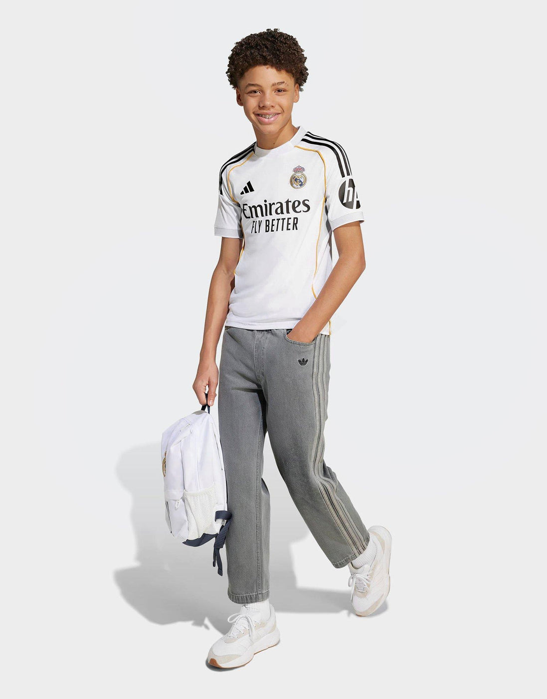 Old meets new with this juniors' Real Madrid 2025/26 Home Shirt from adidas. In White, this stadium shirt has a tonal pattern and design influences from the legendary Bernabéu. It features a crew neckline and short sleeves, while the Black 3-Stripes and Yellow piping nod back to the 09/10 kit. The recycled polyester fabric is lightweight and breathable, with sweat-wicking AEROREADY tech added in for cool comfort. Finished off with the adidas Performance logo and the Real Madrid crest to the chest. Machine washable. | JN8887