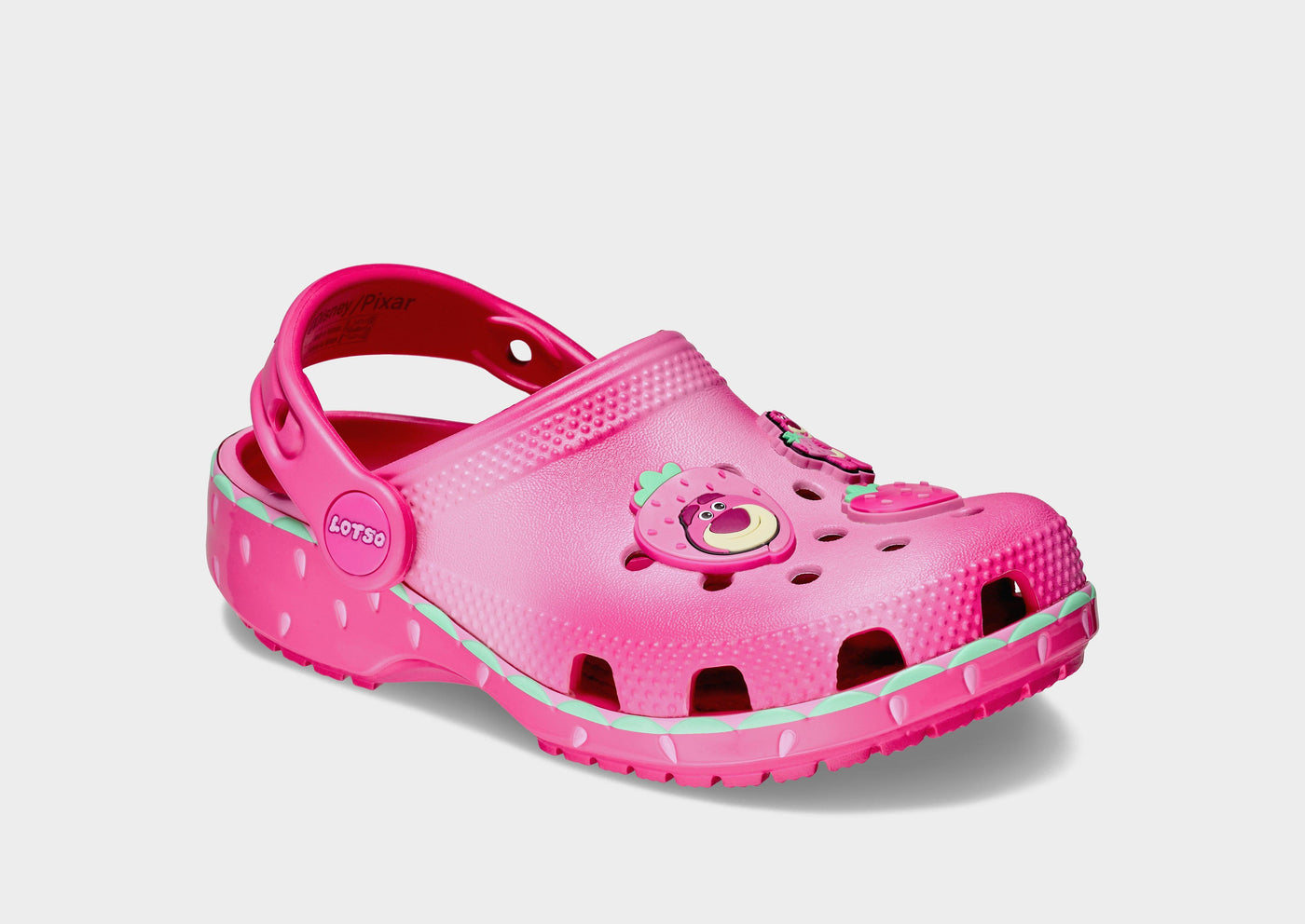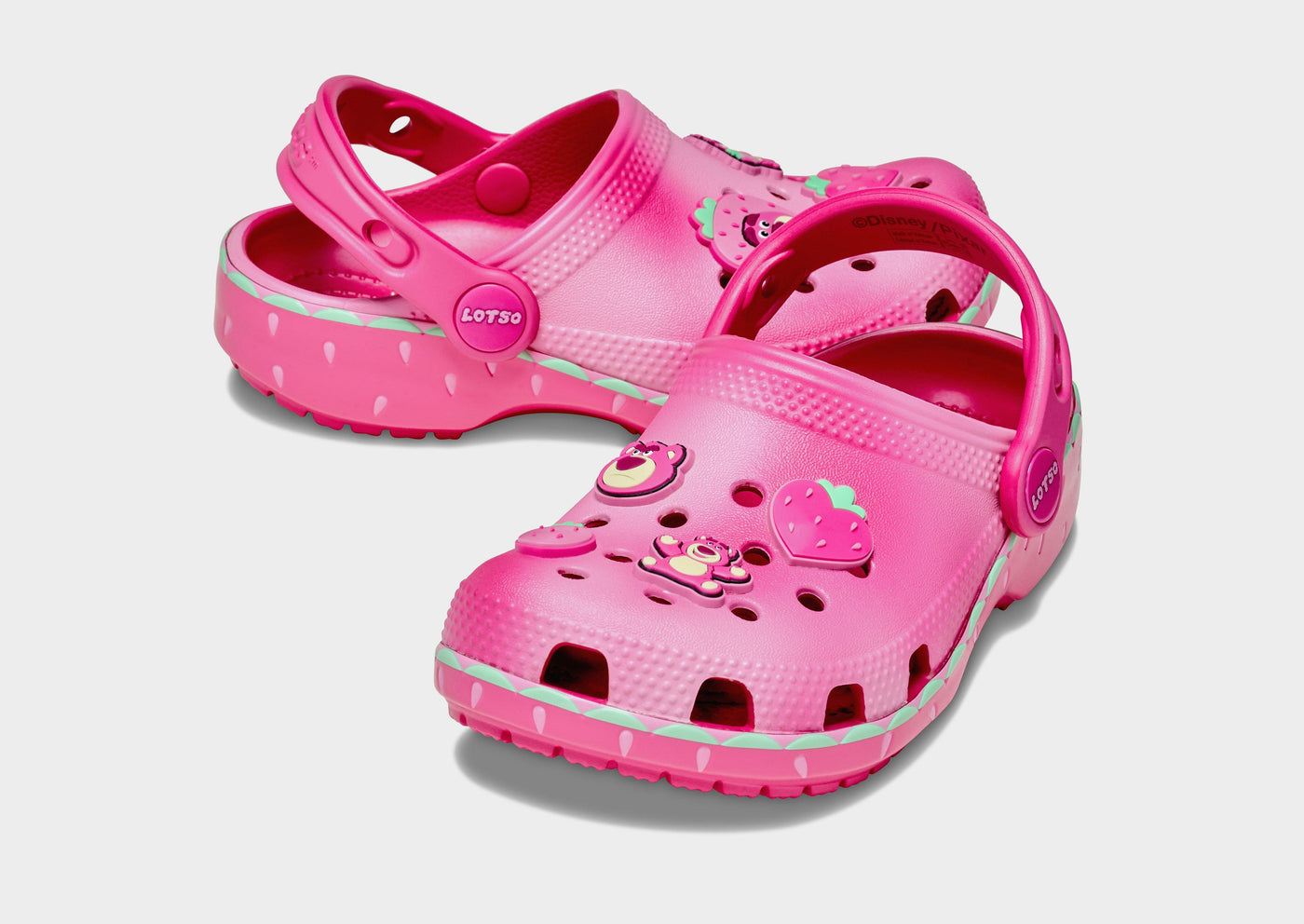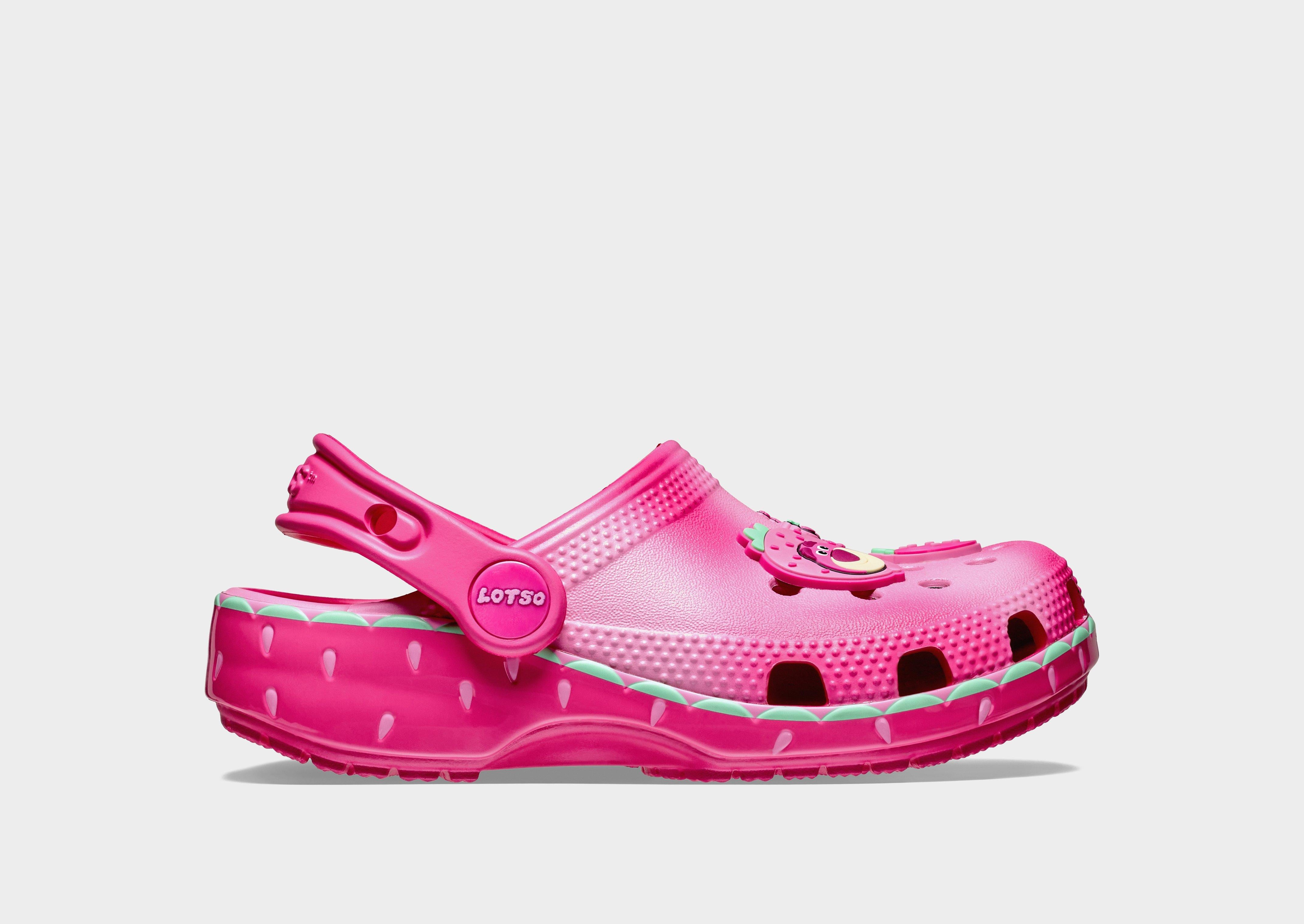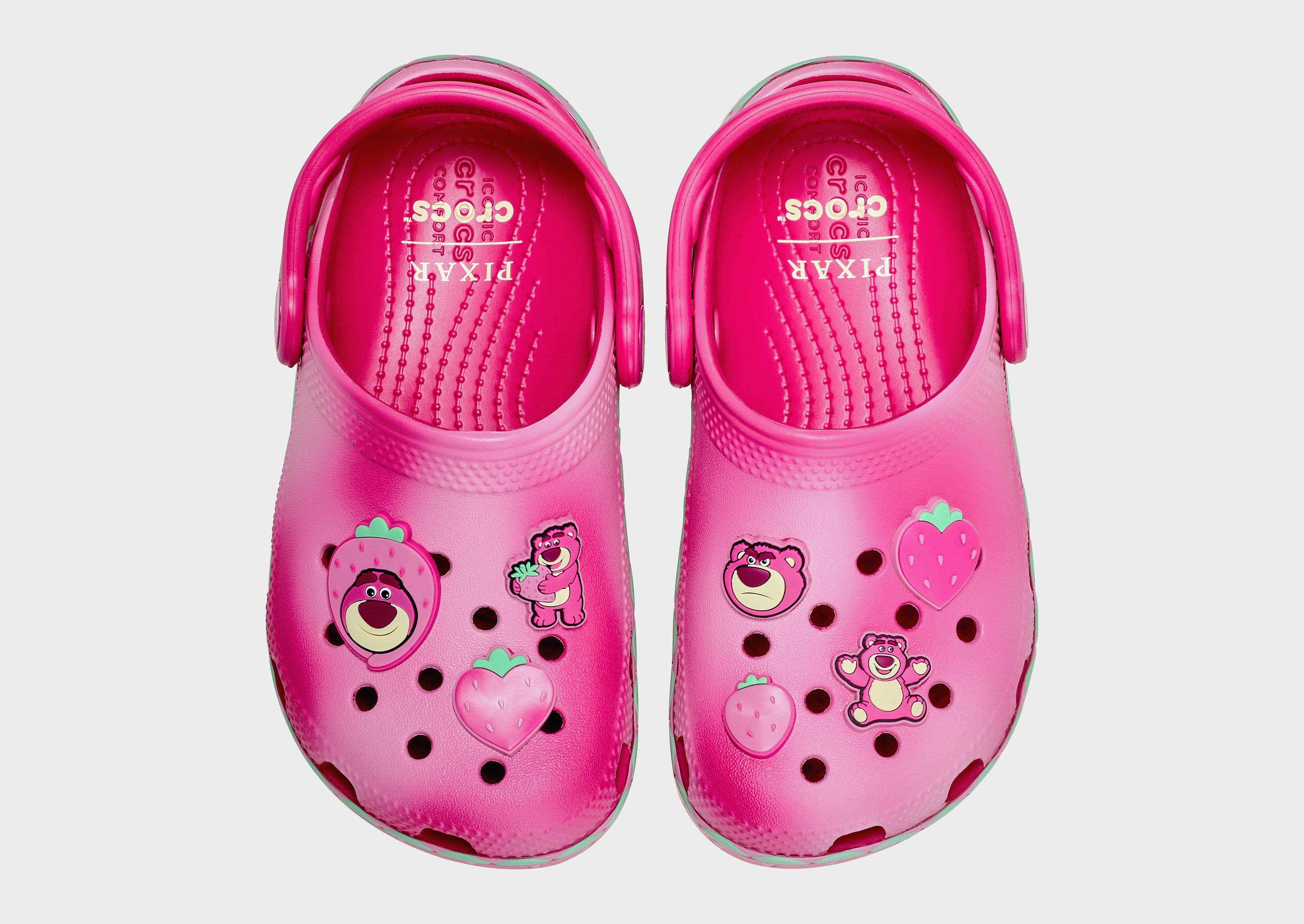 Bring fun to every step with the Lotso Classic Clog! Featuring a soft pink wavy upper and a secure heel strap, these clogs are perfect for little feet. Decorated with playful Lotso and strawberry Jibbitz™ charms, plus extra room for personalization. The outsole shows a subtle strawberry motif, giving a cute, “beary sweet” finish.