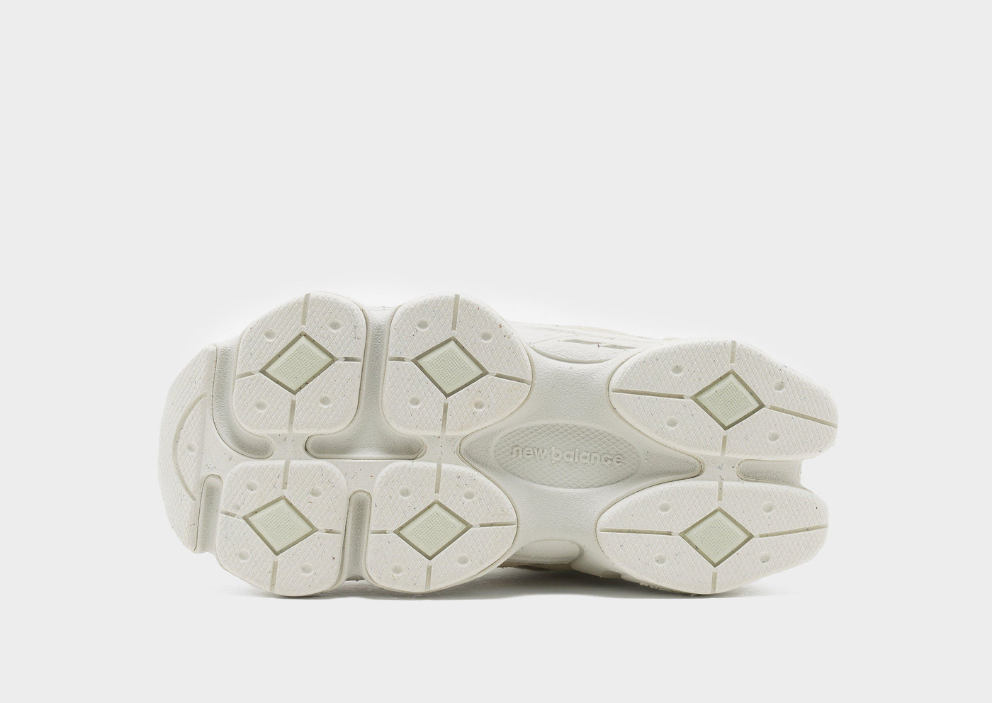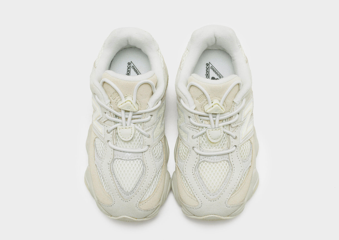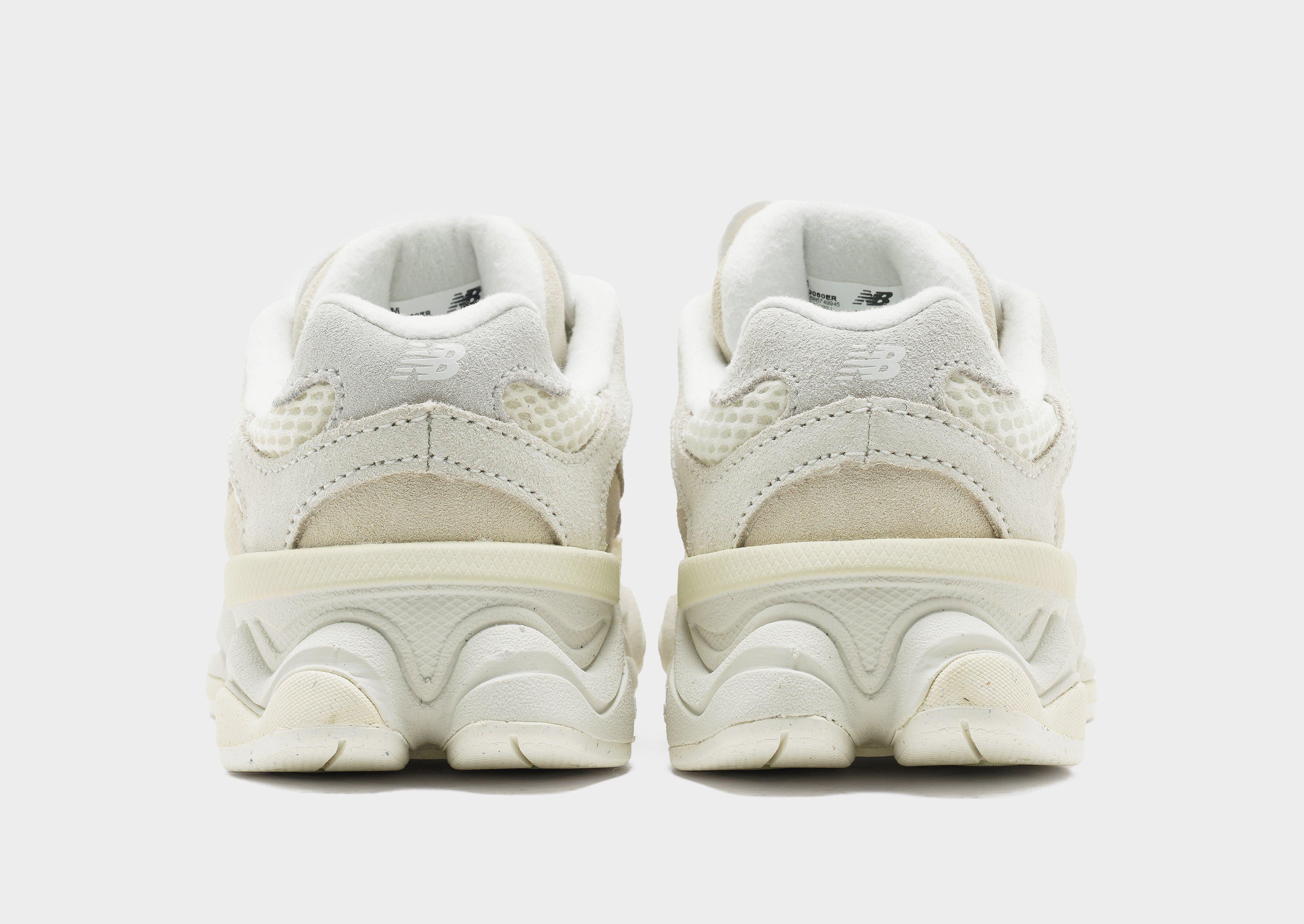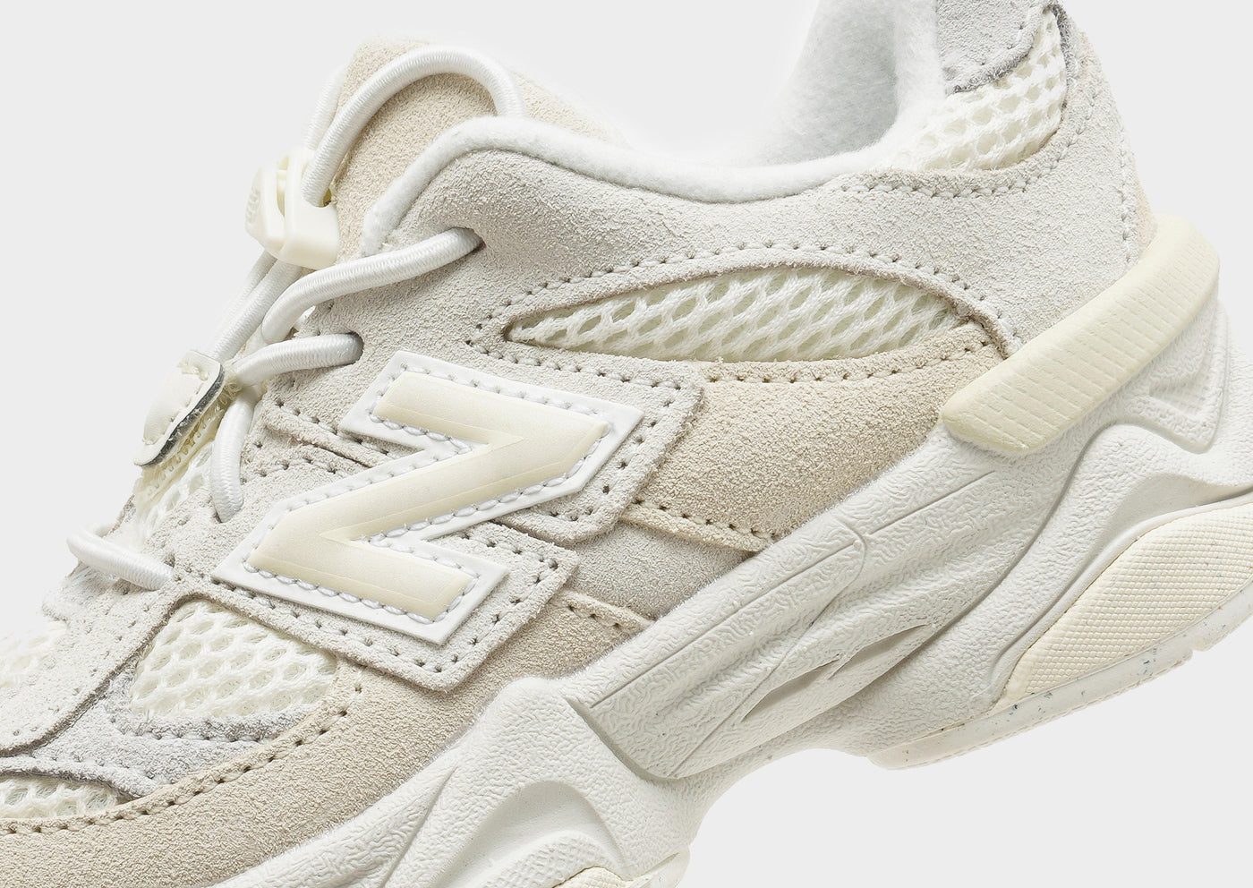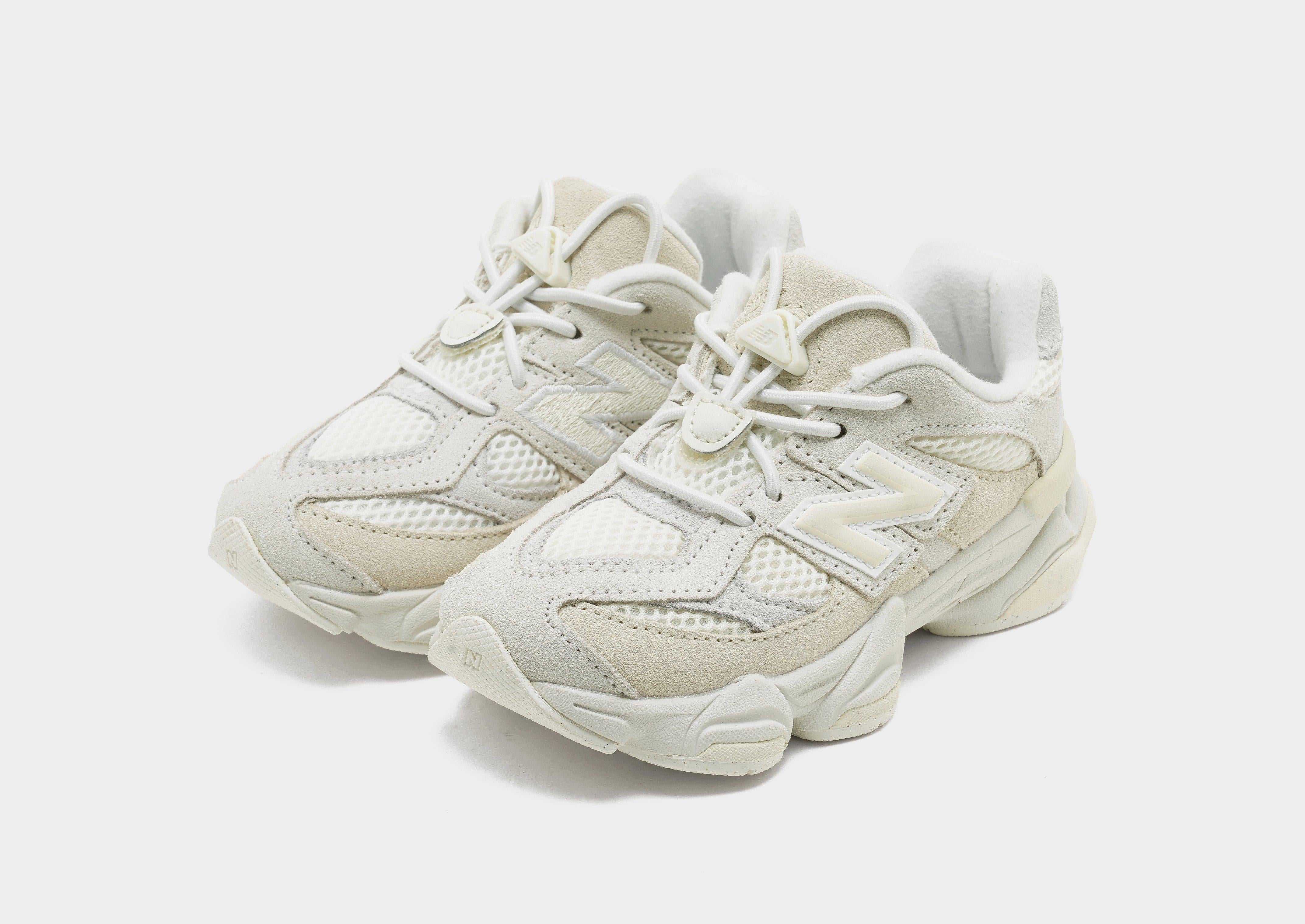 The New Balance 9060 Infant sneaker is a stylish and innovative shoe designed for toddlers and babies, available in several color options such as Bone with Sparrow, Sea Salt with Castlerock, and Slate Gray with Arid Stone. Inspired by the classic 99X series, the 9060 reimagines familiar design elements with a futuristic, Y2K-inspired look. It features a lightweight synthetic suede and mesh upper with expanded sway bars that create a sense of motion, combined with wavy lines and a sculpted pod midsole emphasizing ABZORB cushioning. The shoe includes a dual-density midsole with ABZORB and SBS cushioning for comfort and impact absorption, a translucent CR device in the heel for stability, and a diamond-pattern outsole inspired by the classic 860 design. It weighs approximately 110 grams (3.9 oz) and uses a bungee closure with an adjustable toggle for easy on and off, making it a functional and fashionable choice for your little one's early steps