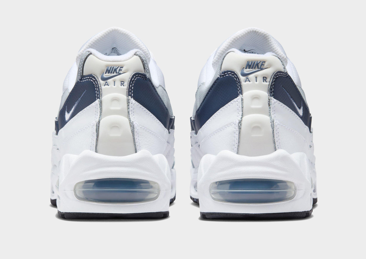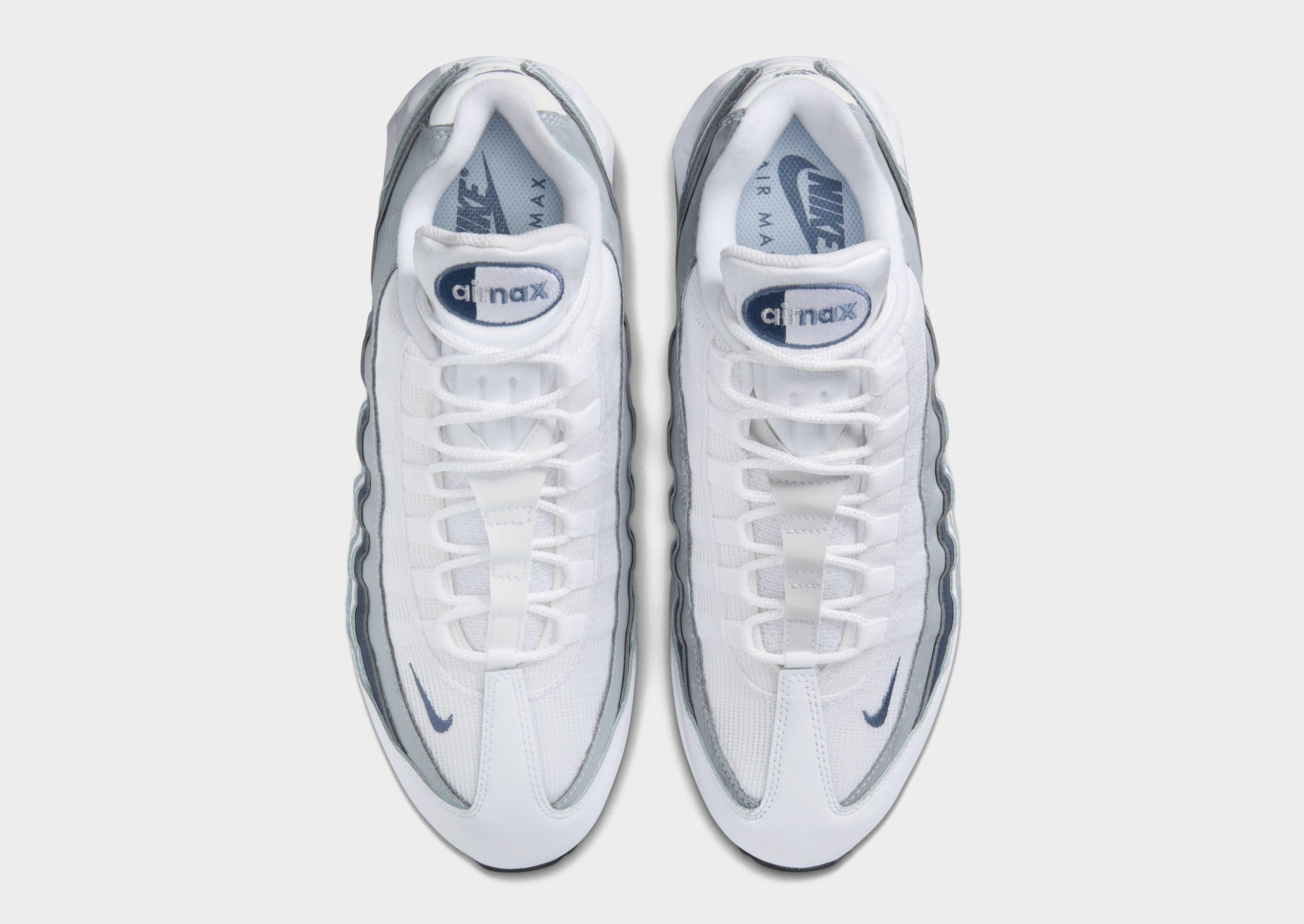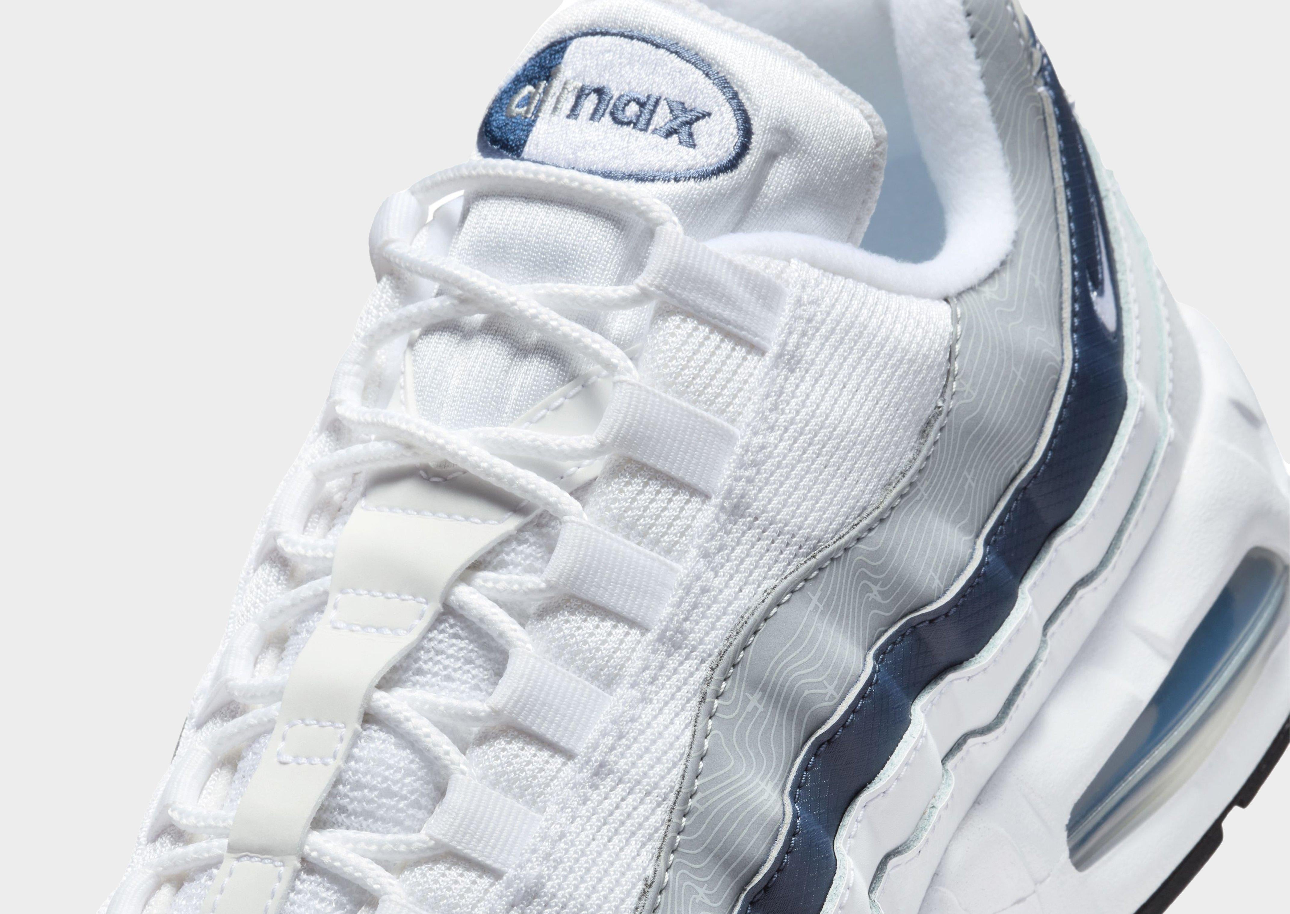 Elevate your sneaker game with the Nike Air Max 95 trainers, a nod to '90s running culture. Featuring a fresh White, Diffused Blue, and Midnight Navy colourway, these JD-exclusive kicks combine real and synthetic leather with textile layers on the upper for a dynamic, textured look.