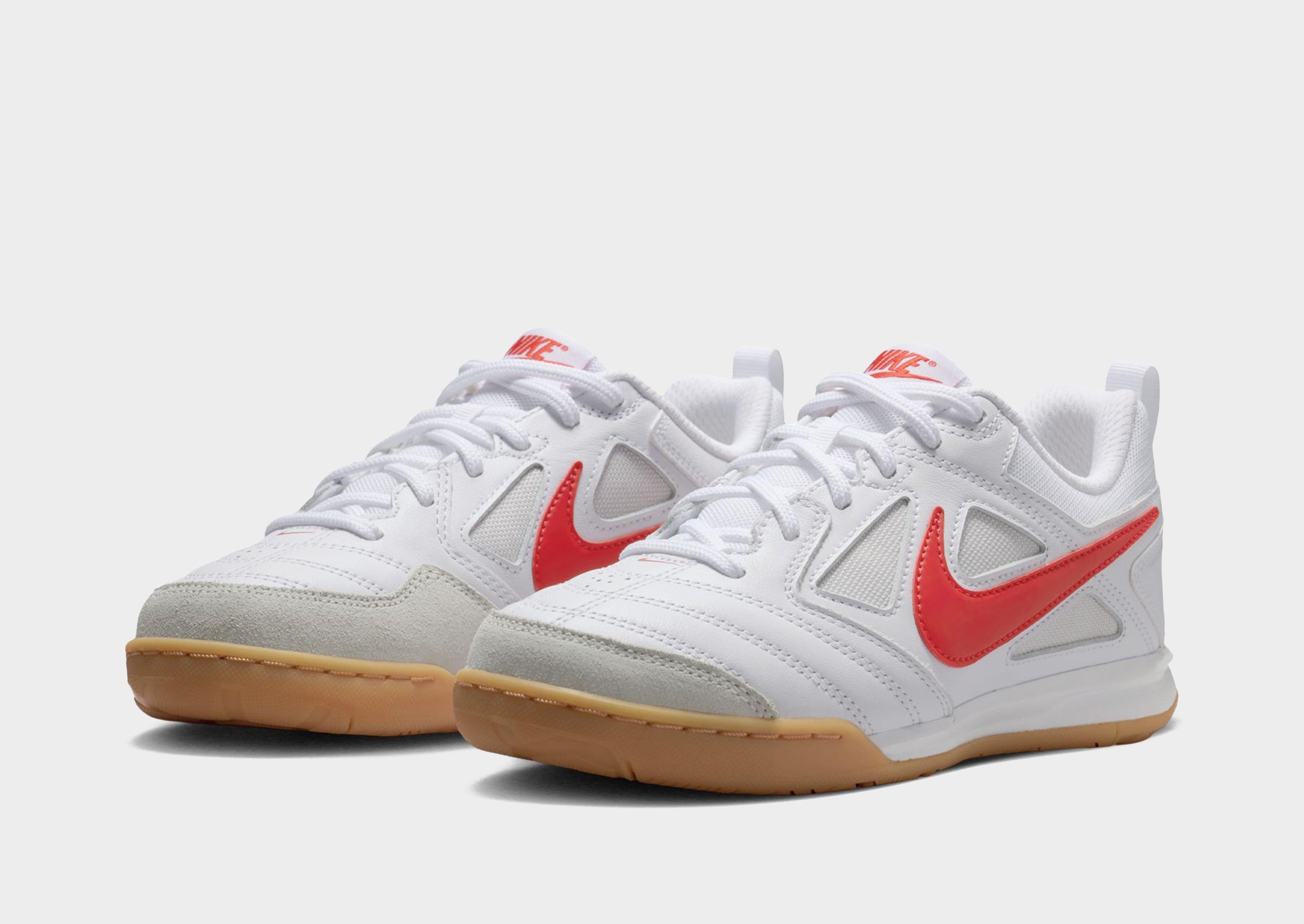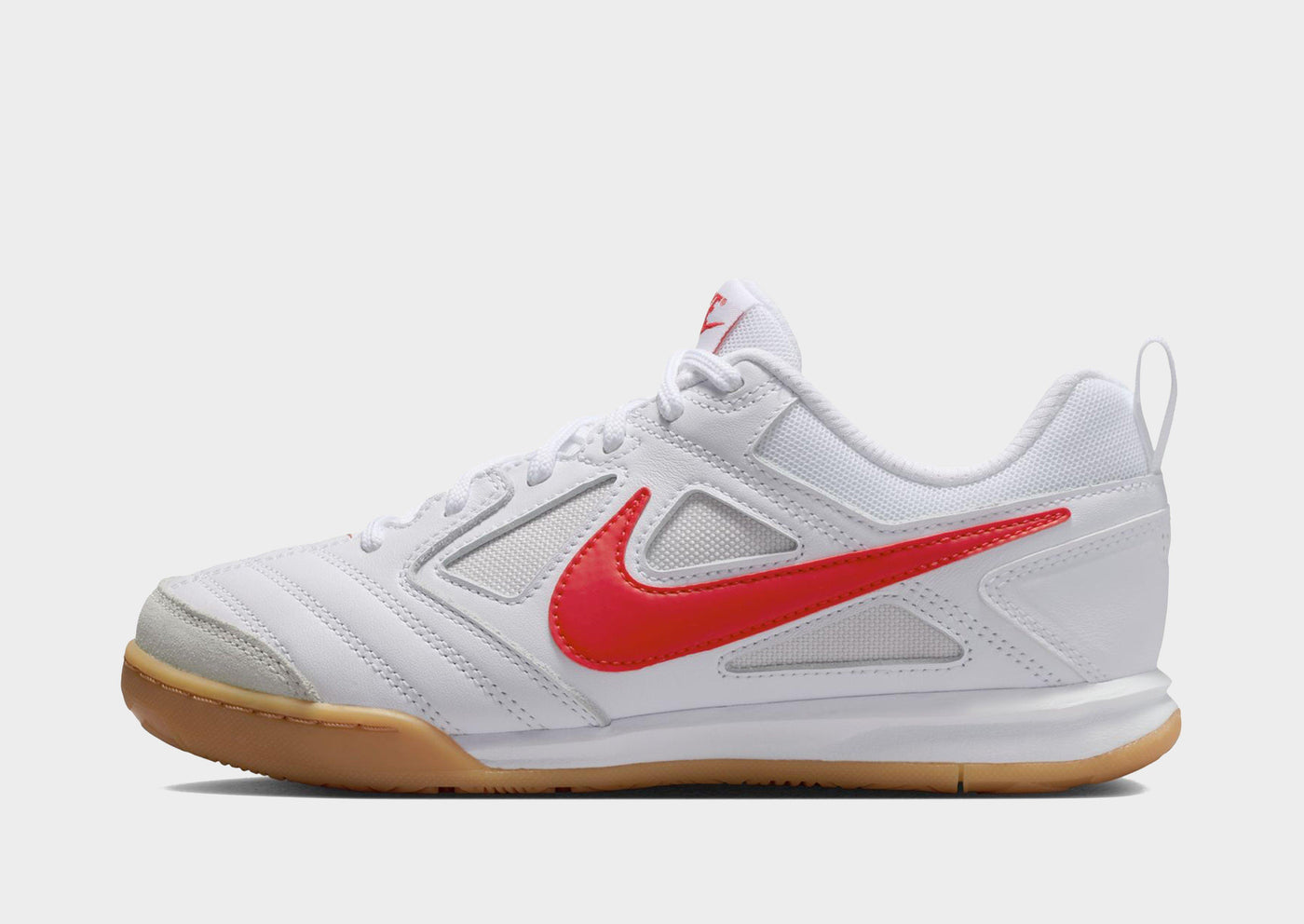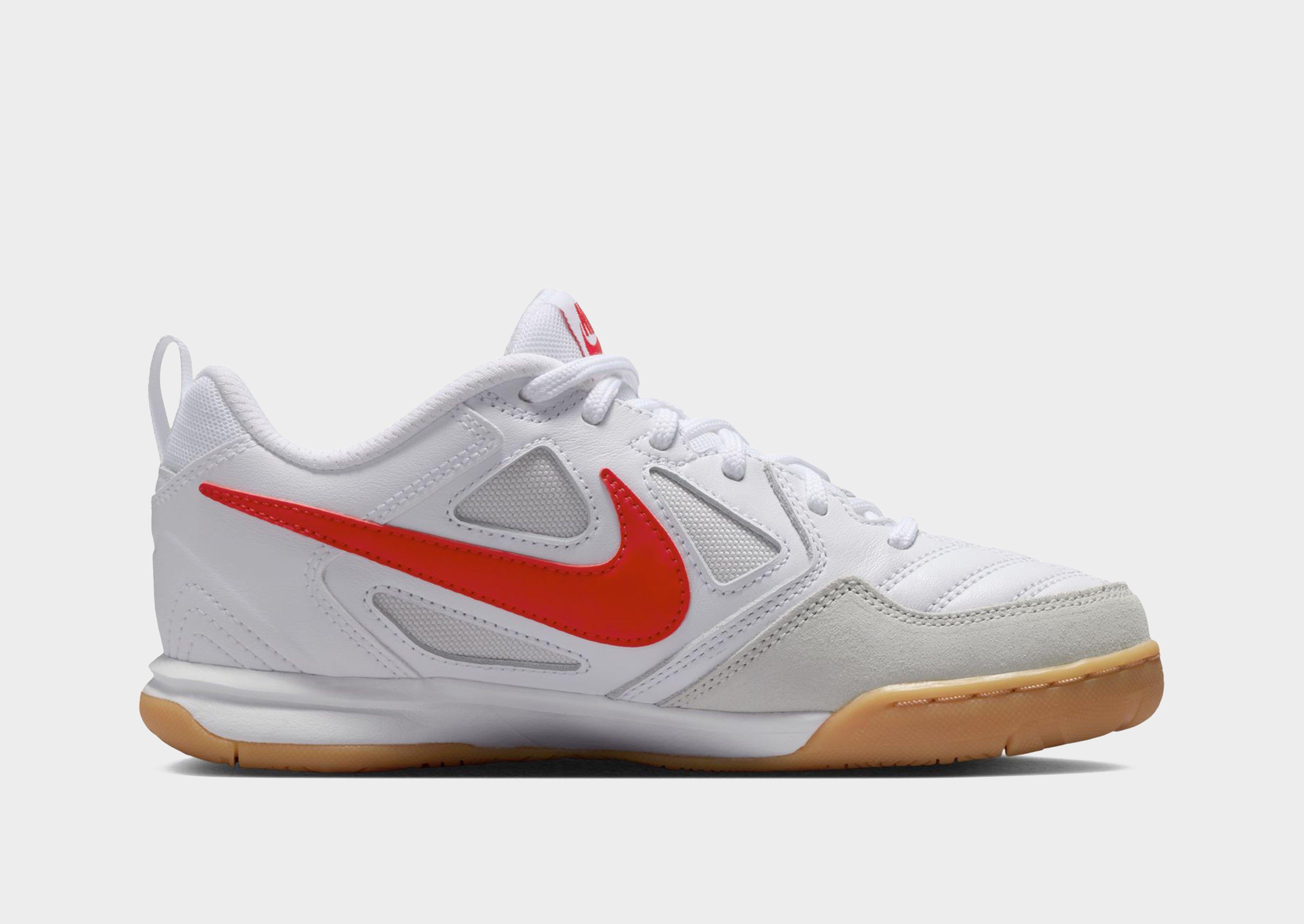 The Nike Gato BG in White/Red-Yellow is a retro indoor football shoe reimagined for streetwear and casual use. Originally designed for futsal, it features a premium leather and suede upper with mesh panels for breathability and durability. The low-profile design offers excellent touch and close-to-ground feel, while the gum rubber outsole with hexagonal traction patterns ensures grip on indoor and hard surfaces. Lightweight cushioning in the midsole adds comfort for all-day wear. Known for its snug fit and classic indoor styling, this colorway blends crisp white with bold red and yellow accents for a clean, sporty look.