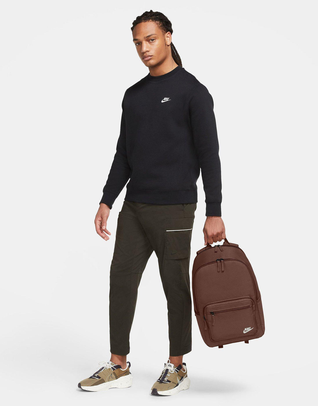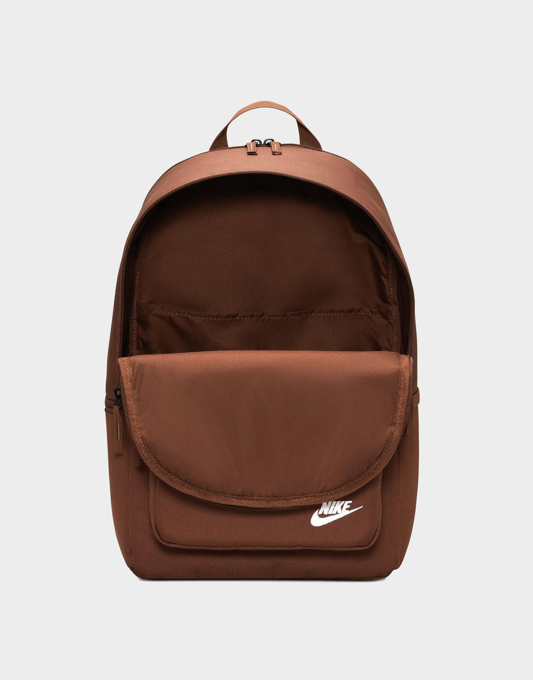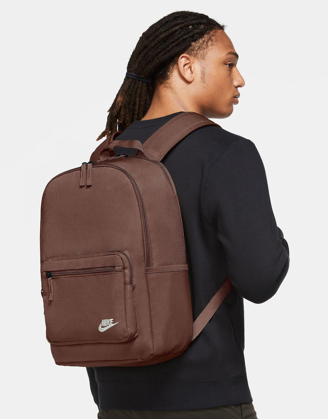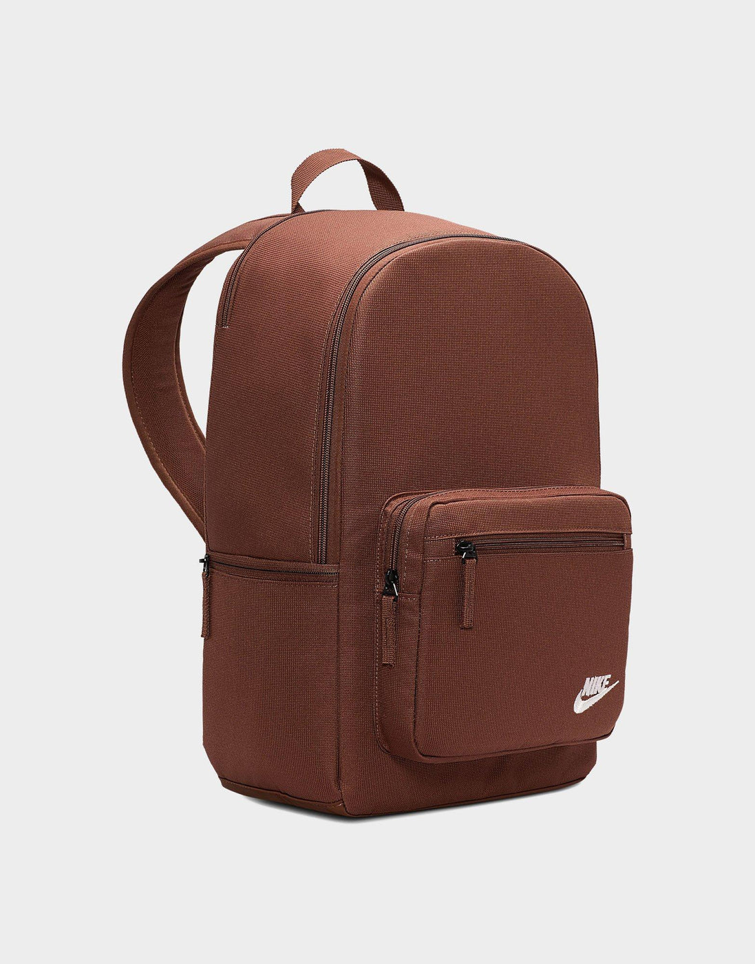 Take your essentials anywhere with the Nike Heritage Eugene Backpack. Built from durable, densely woven polyester with a water-resistant coating, it keeps your gear protected rain or shine. The 23L main compartment offers plenty of space for everyday must-haves, while an internal padded sleeve fits laptops up to 15 inches. A front zip pocket and side compartment keep smaller items organized and easy to reach. Finished with padded shoulder straps and a haul loop for comfortable carrying, this Brown/White backpack blends classic Nike style with everyday function.