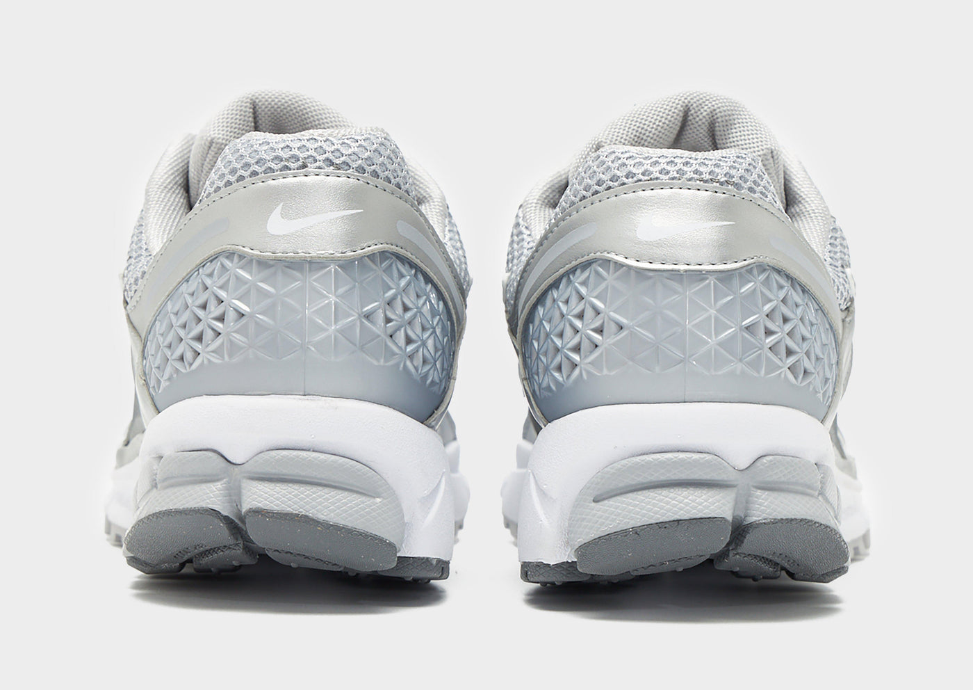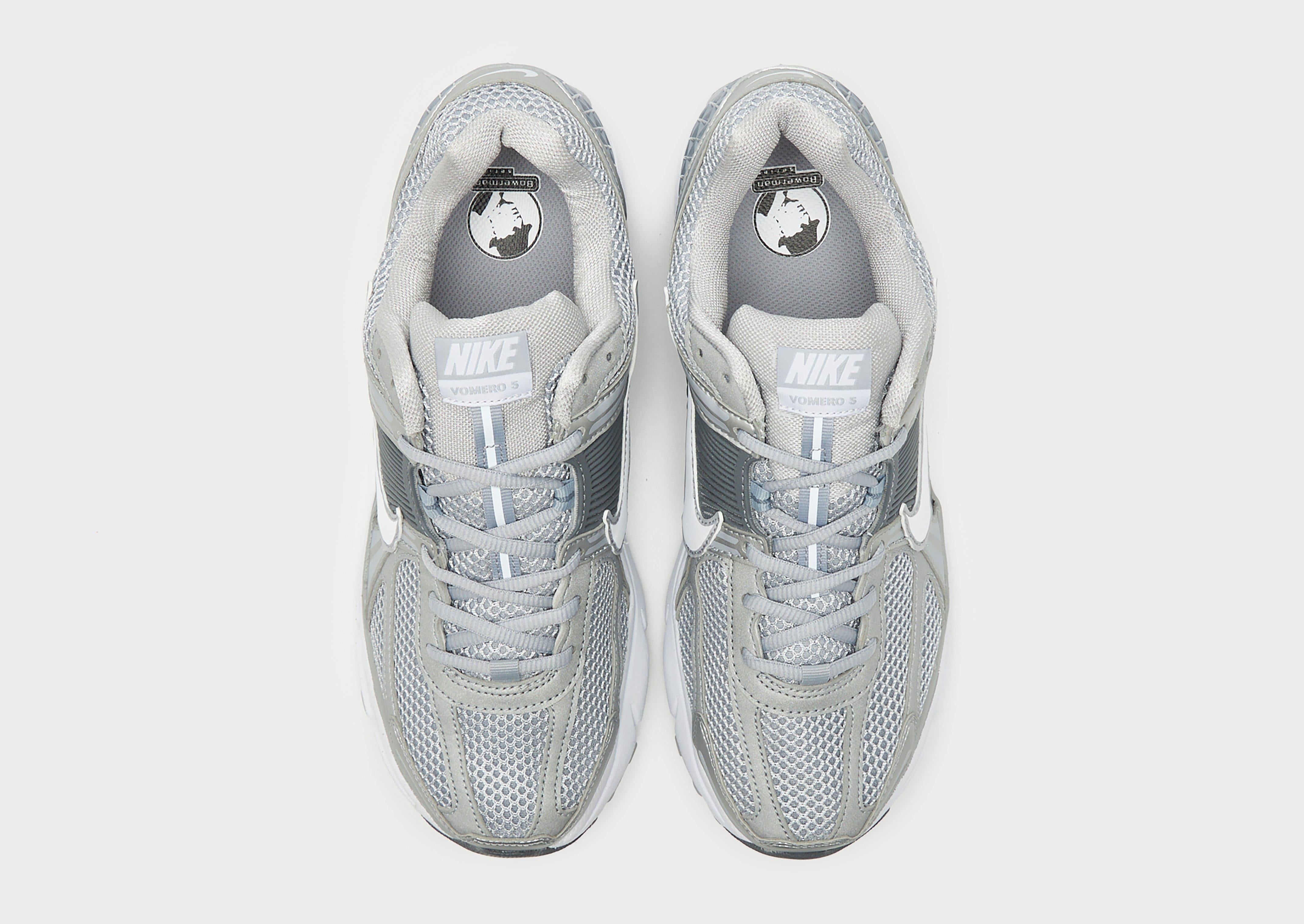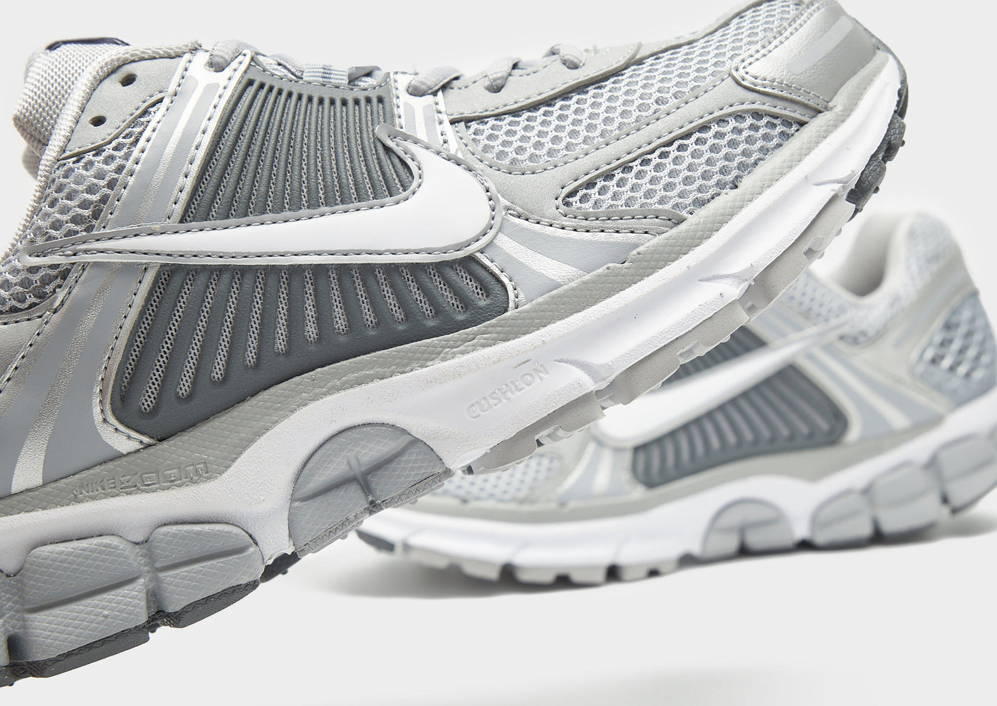 Celebrate Nike's running heritage with these men's Zoom Vomero 5 trainers. In a Wolf Grey, White and Metallic Silver colourway, these runner-inspired sneakers have a breathable mesh base, with synthetic leather overlays and a plastic cage for support. They feature padding at the tongue and ankle collar for a comfy fit, while the Zoom Air cushioning delivers a snappy and springy step. With a durable rubber outsole for lasting grip, they're finished off with the iconic Swoosh on the sidewalls.
