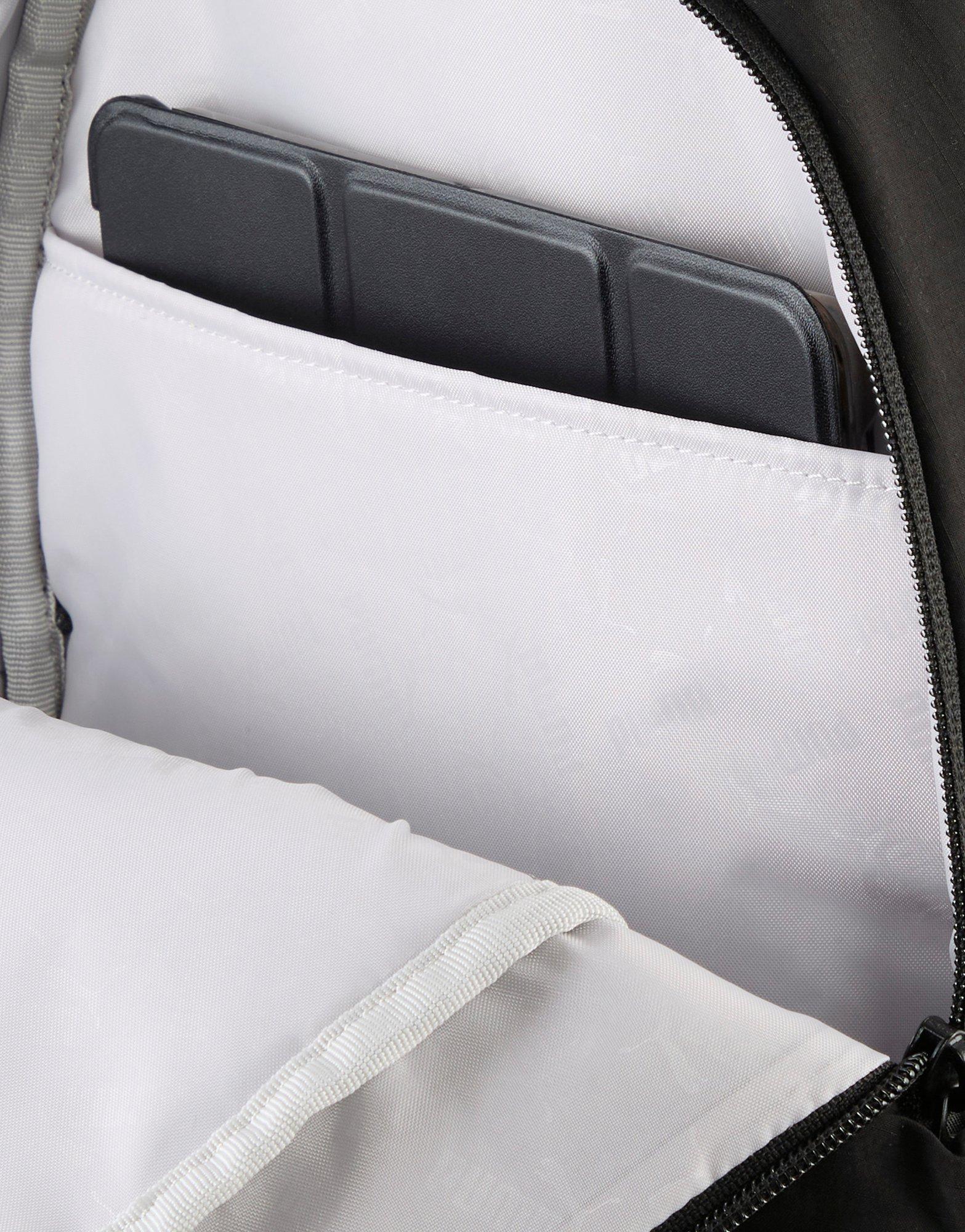 Crafted with at least 90% recycled materials, it features a two-way reversed zip opening into the main compartment, an exposed front zip pocket for extra storage, and two side pockets with adjustable drawcord closures. The internal soft-lined sleeve safely stows your belongings, while adjustable webbing shoulder straps provide a customizable fit.