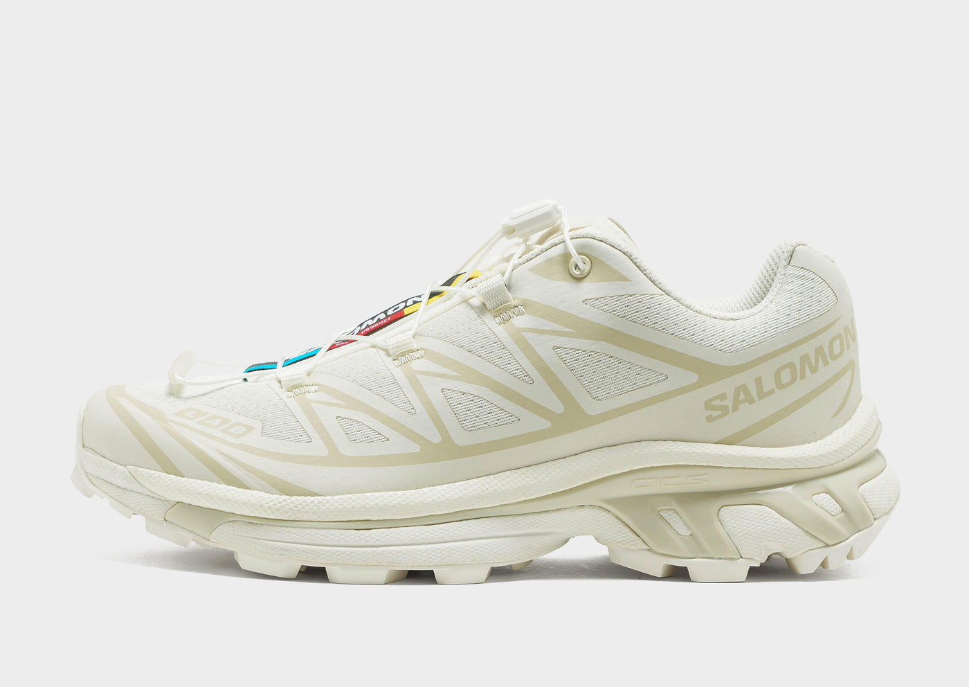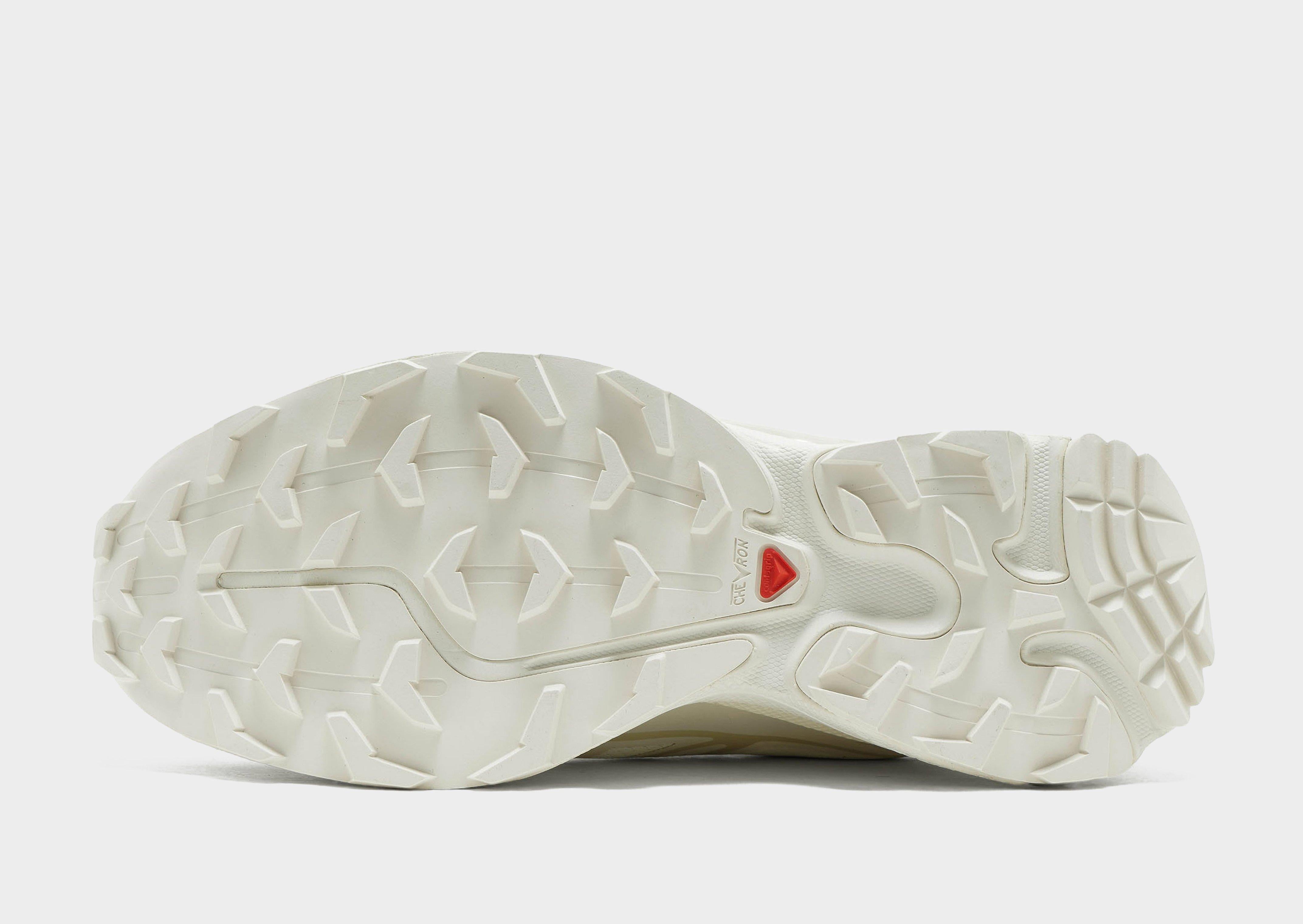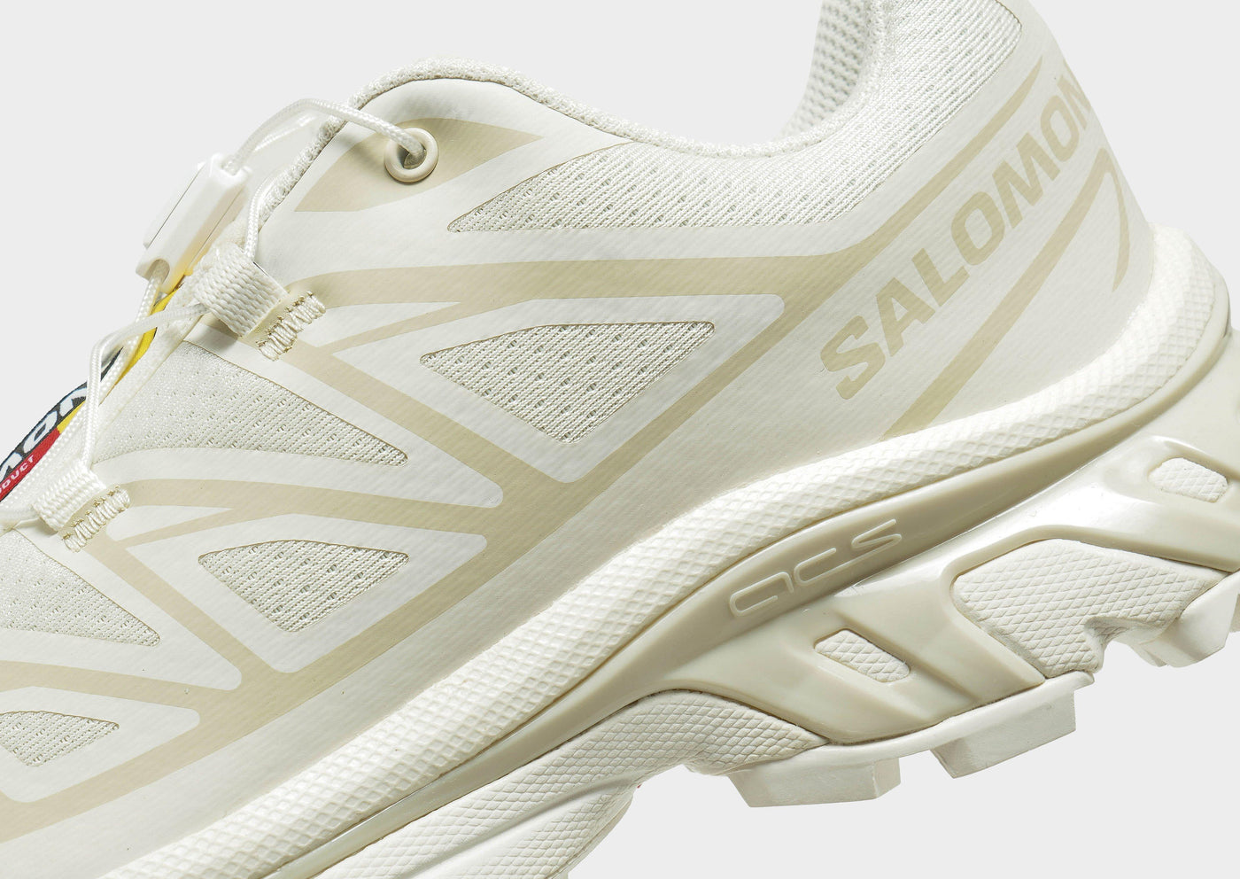 The Salomon XT-6 Vanilla Ice Almond Milk is a high-octane sneaker fit for challenging speed hikes over trails of various terrain. These sneakers also offer style and panache with every step. This rough and ready trail shoe begins with an upper base made of a single layer of mesh in Creamy White. TPU film in Creamy White and beige runs over the upper, adding both style and structural support. The toecap and heel are especially fortified. A Quicklace lacing system offers one-pull tightening for a secure fit. Dual-density EVA cushioning in beige and cream creates a midsole to offer springy comfort over rugged terrain. The downhill chassis construction and the lugs geometry of the white rubber outsole complete the look and capability of this shoe.