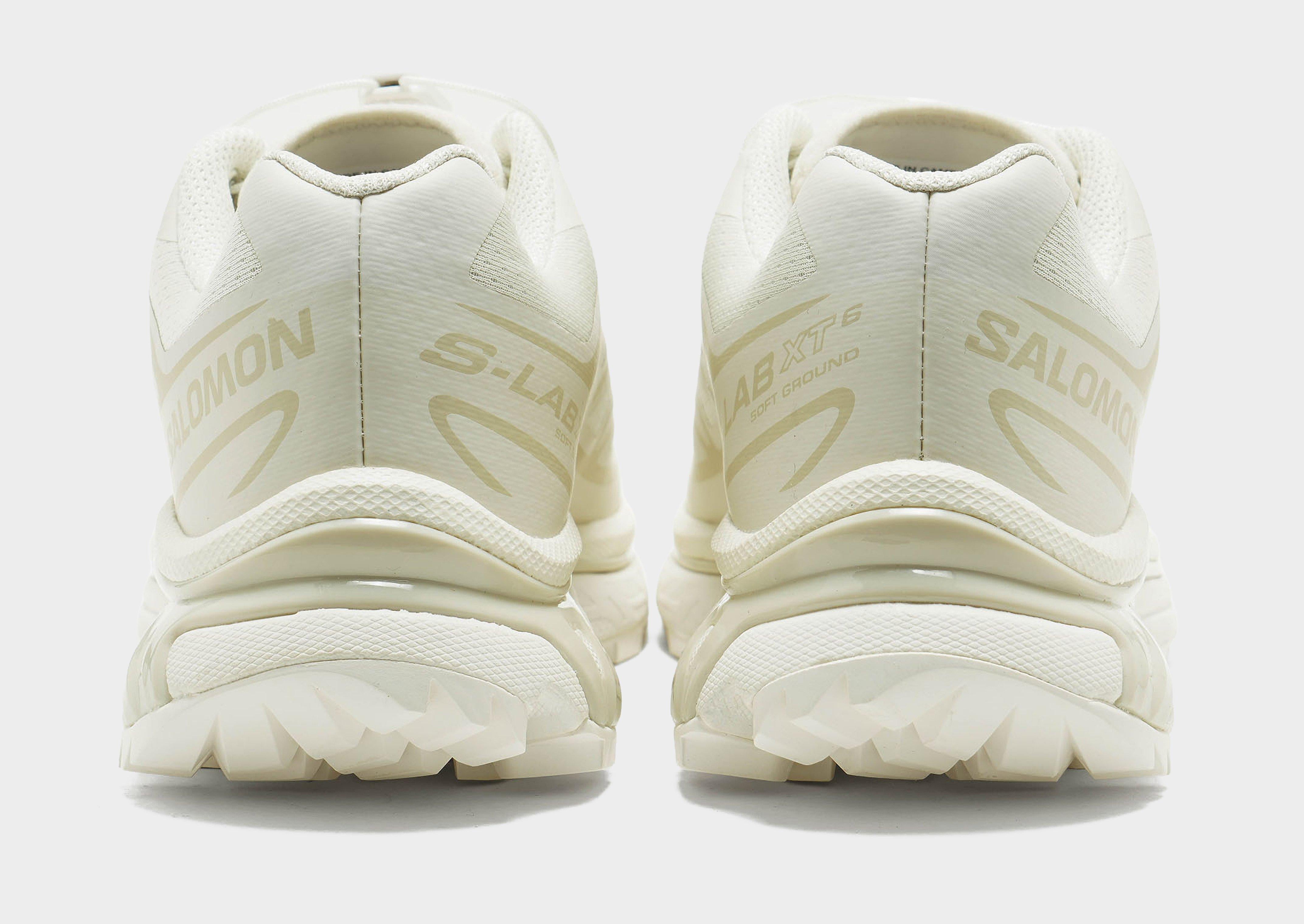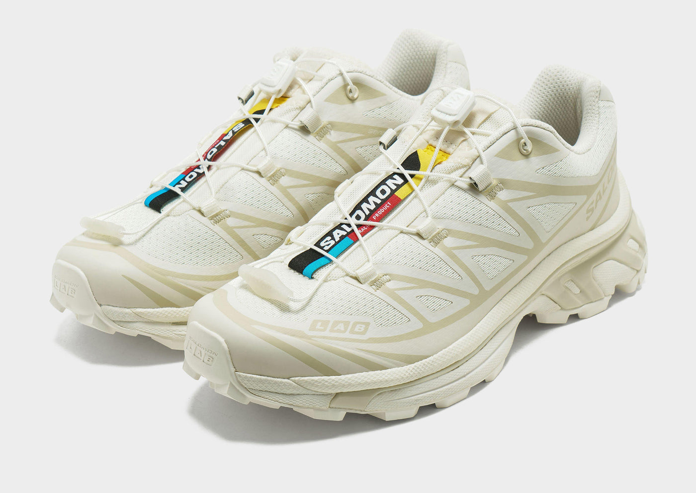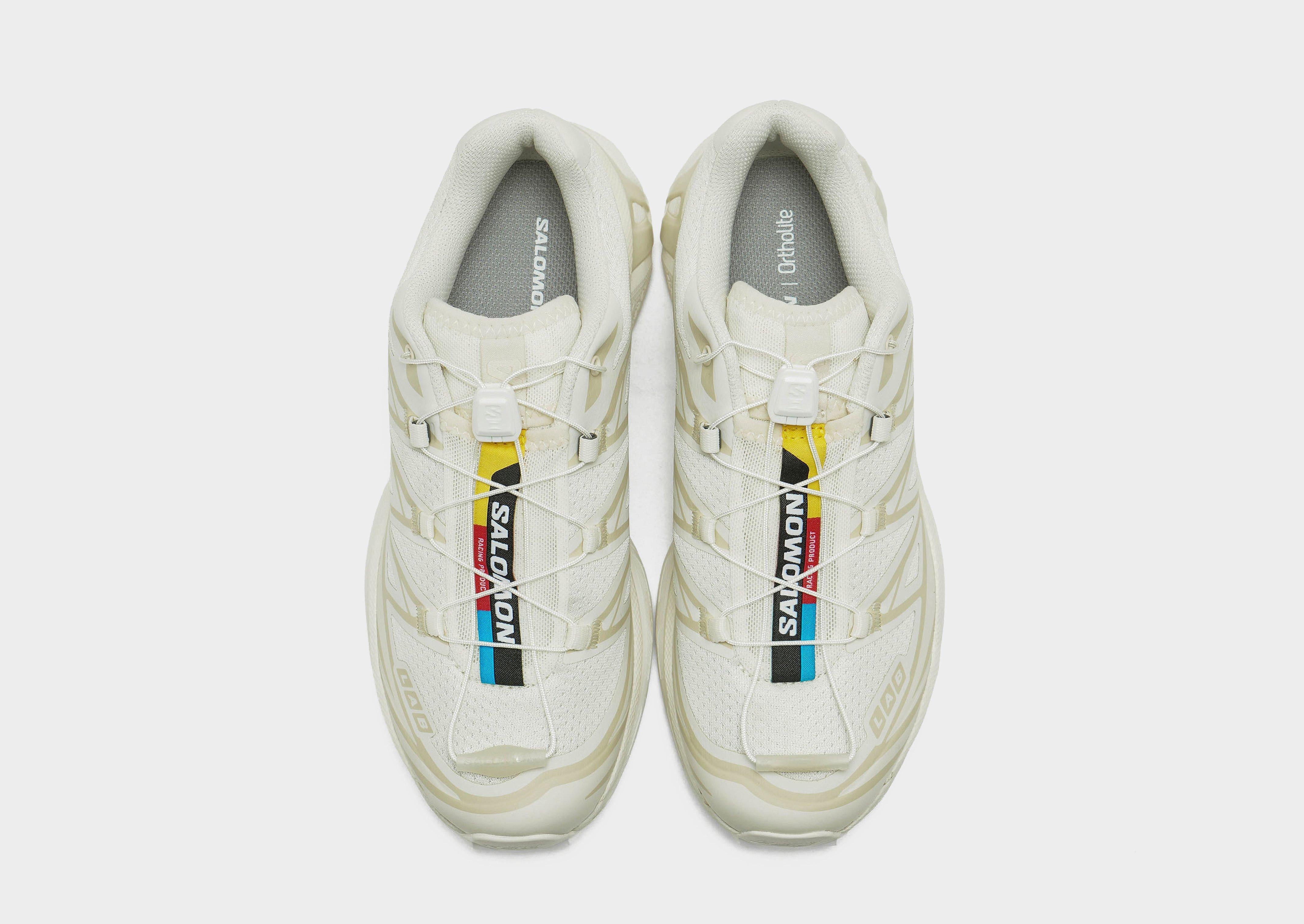 The Salomon XT-6 Vanilla Ice Almond Milk is a high-octane sneaker fit for challenging speed hikes over trails of various terrain. These sneakers also offer style and panache with every step. This rough and ready trail shoe begins with an upper base made of a single layer of mesh in Creamy White. TPU film in Creamy White and beige runs over the upper, adding both style and structural support. The toecap and heel are especially fortified. A Quicklace lacing system offers one-pull tightening for a secure fit. Dual-density EVA cushioning in beige and cream creates a midsole to offer springy comfort over rugged terrain. The downhill chassis construction and the lugs geometry of the white rubber outsole complete the look and capability of this shoe.